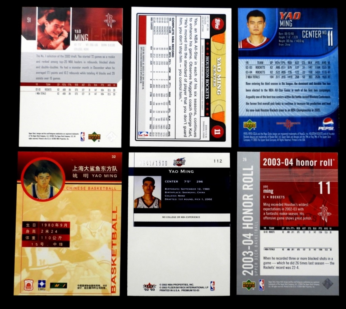 6 YAO MING TRADING CARDS. FLEER (941/1500), OMNI CHINESE CARD, UD PEPSI, TOPPS 2008. VG/NM
