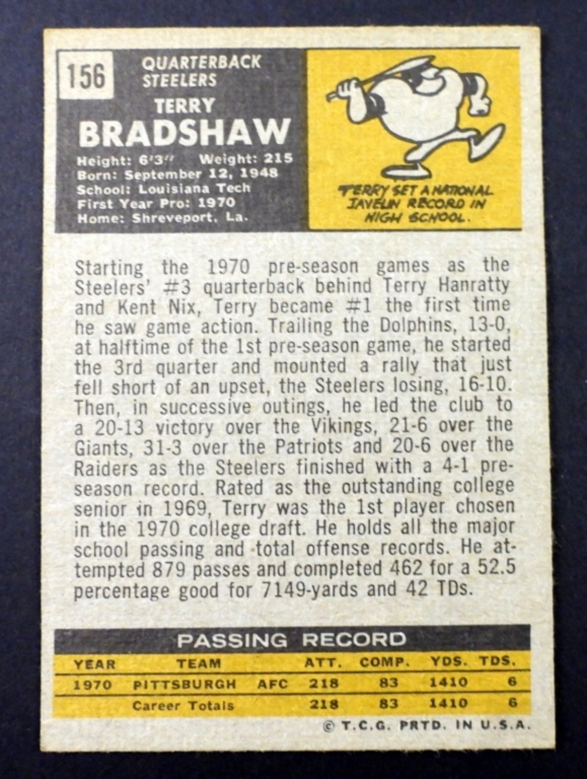 #156 STEELERS ROOKIE TERRY BRADSHAW – VGEX – GREAT COLOR
