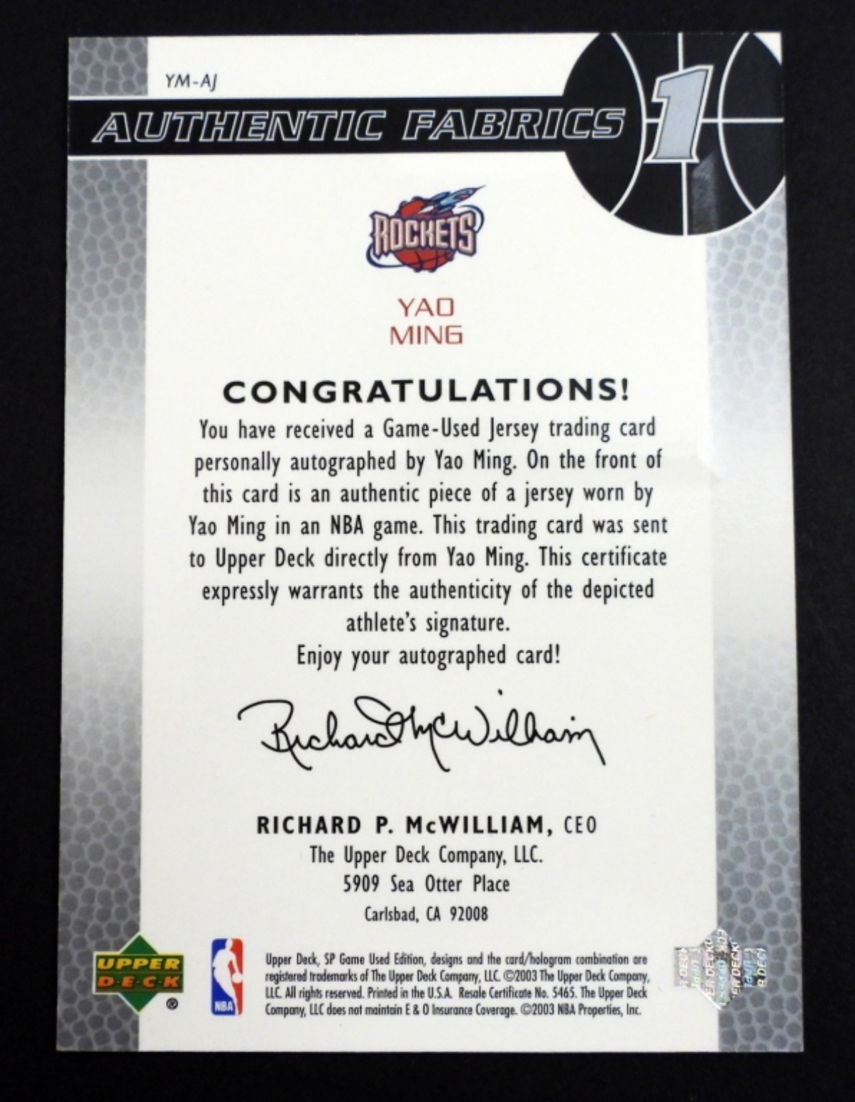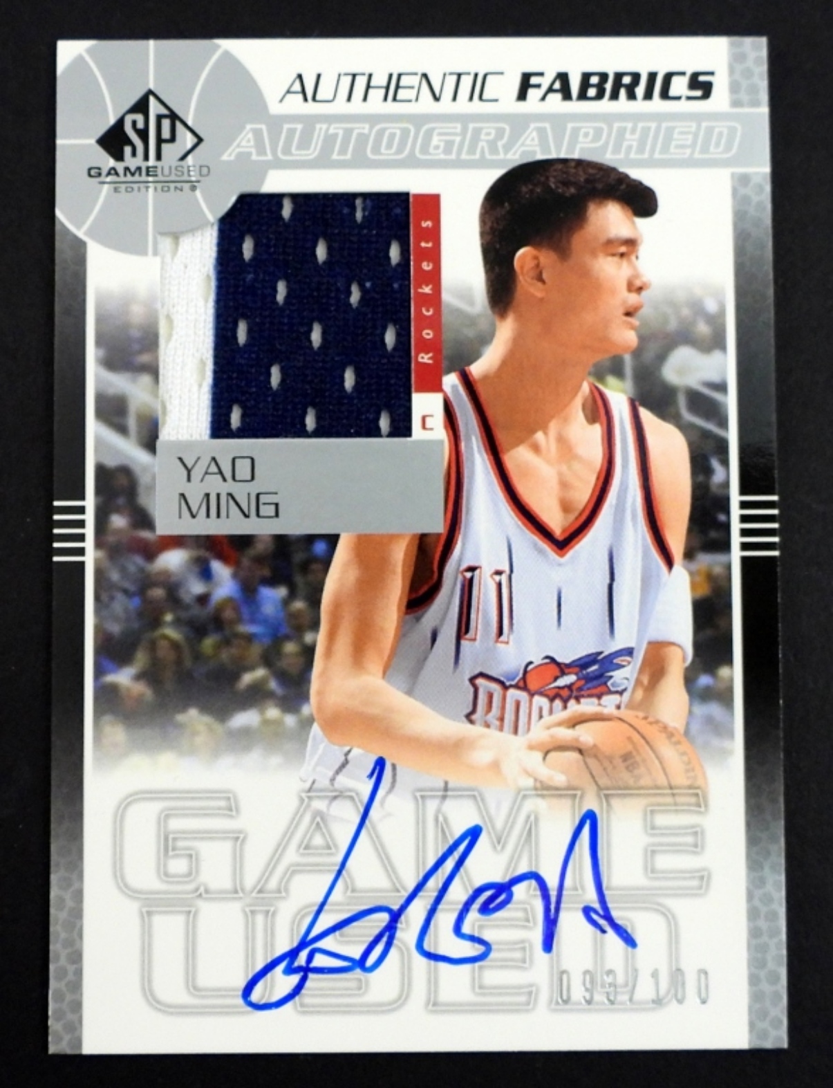 2003 UPPER DECK YAO MING AUTHENTIC FABRICS AUTOGRAPHED CARD.USED JERSEY TRADING CARD PERSONALLY SIGNED