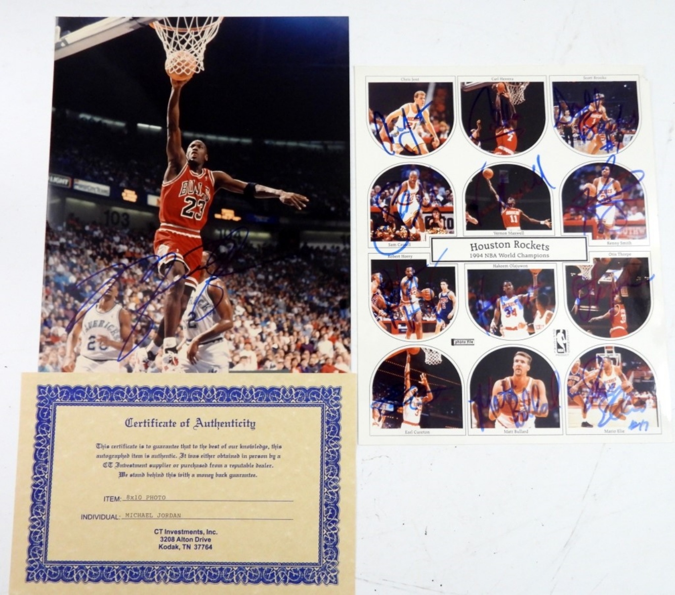 JORDAN PHOTO COMES WITH COA. ALSO HOUSTON ROCKETS 1994 WORLD CHAMPS SIGNED PHOTO 12 SIGNATURES