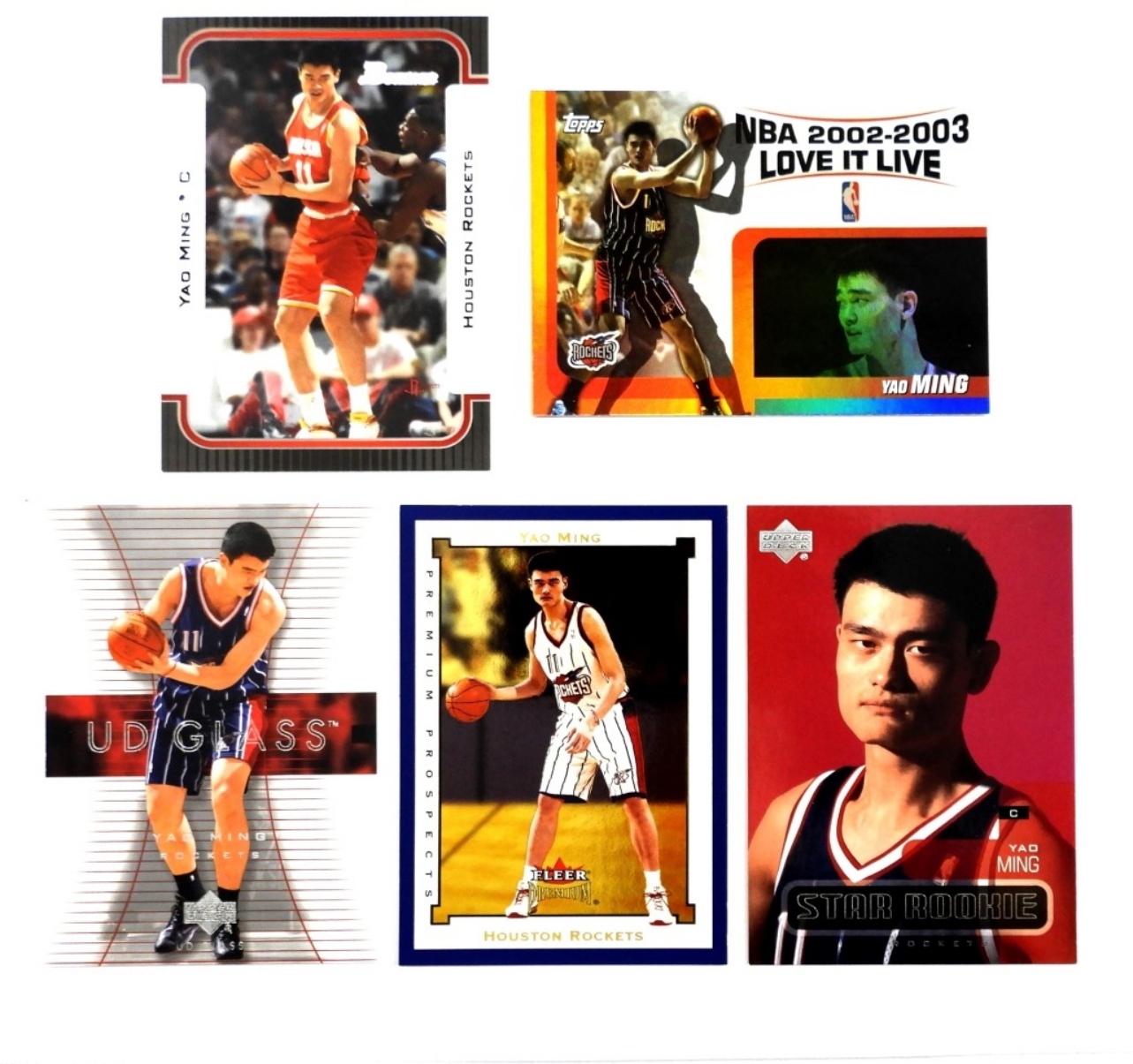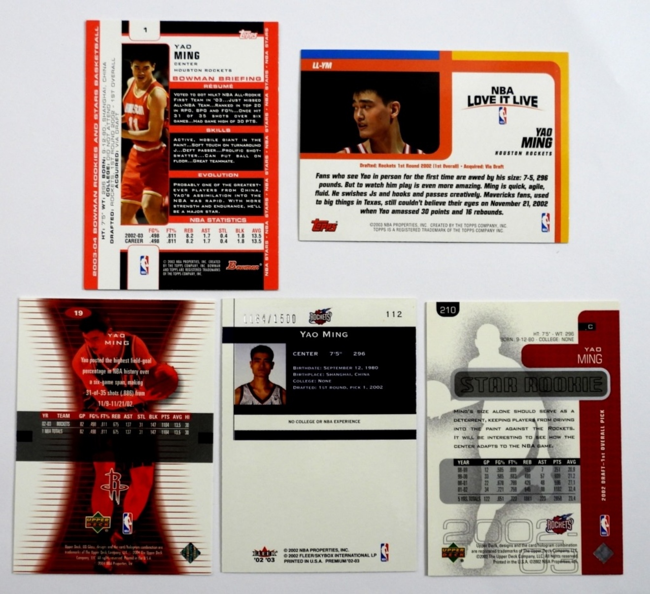 5 YAO MING CARDS, SOME LIMITED. FLEER #112 2002 1164/1500. UPPER DECK #210 2002 ROOKIE CARD.