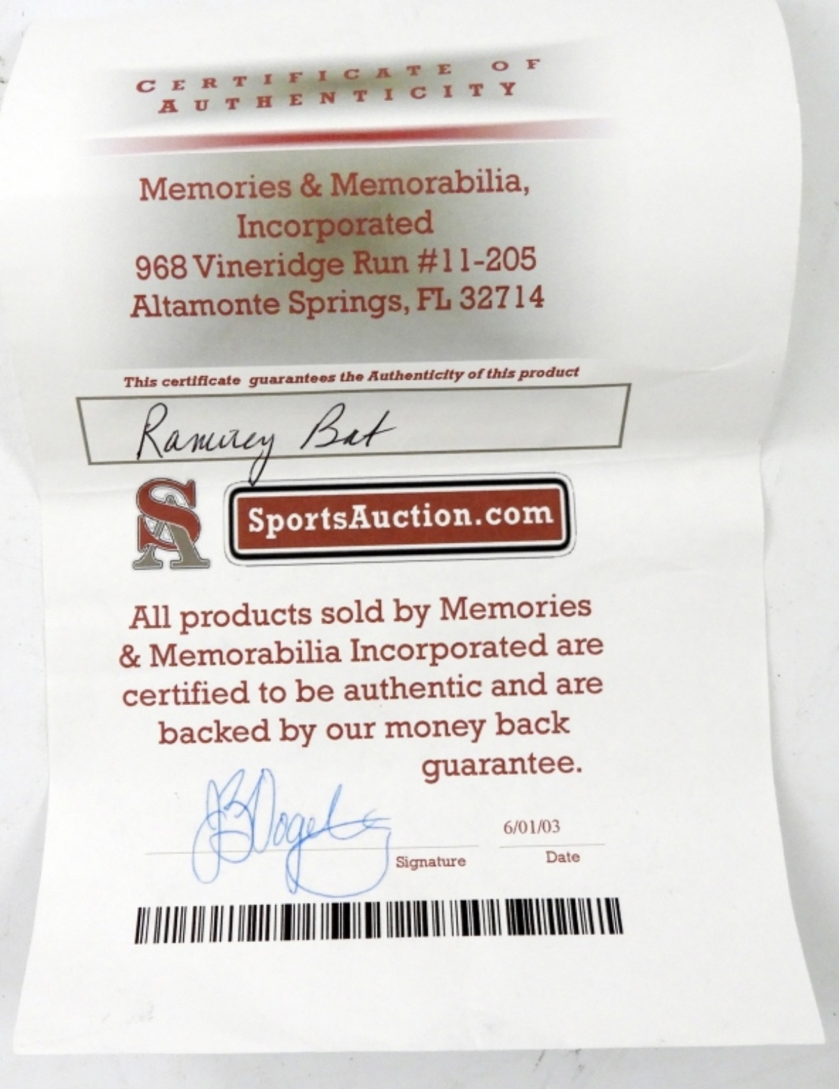 COMES WITH MEMORIES AND MEMORABILIA INC COA