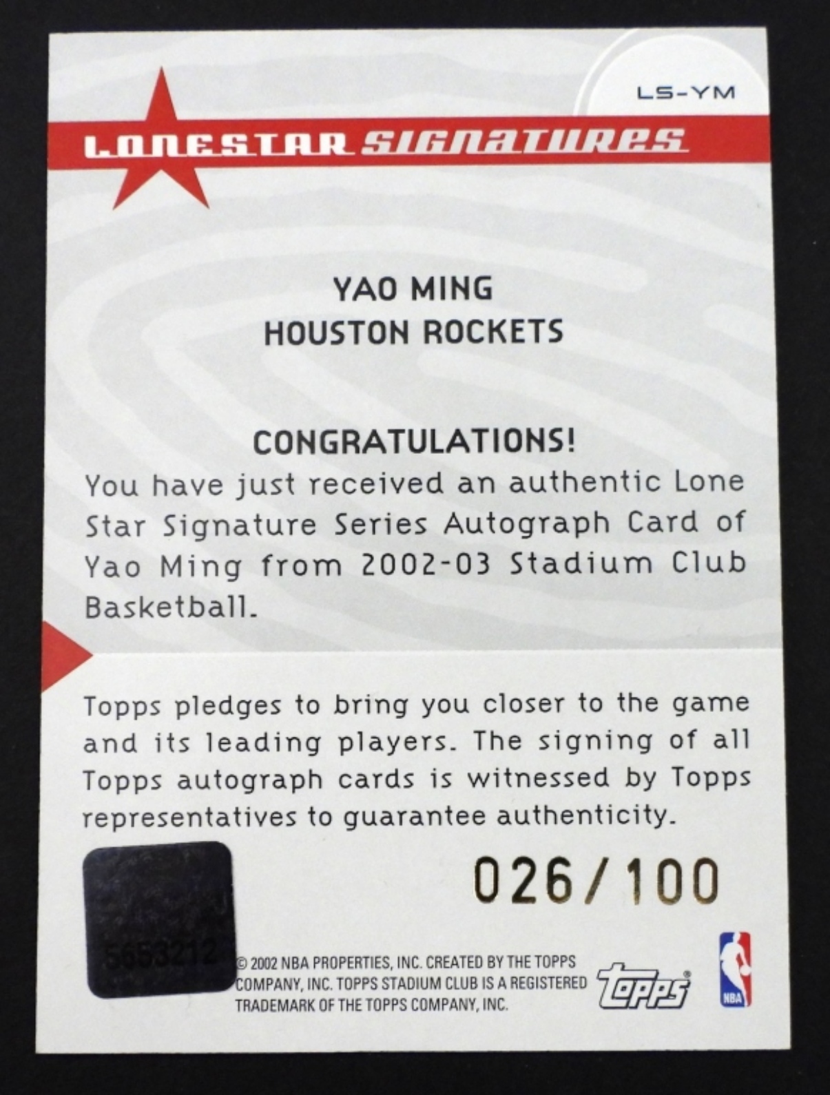 2002-2003 TOPPS AUTOGRAPHED YAO MING LONE STAR SIGNATURES ,HOUSTON ROCKETS.026/100.