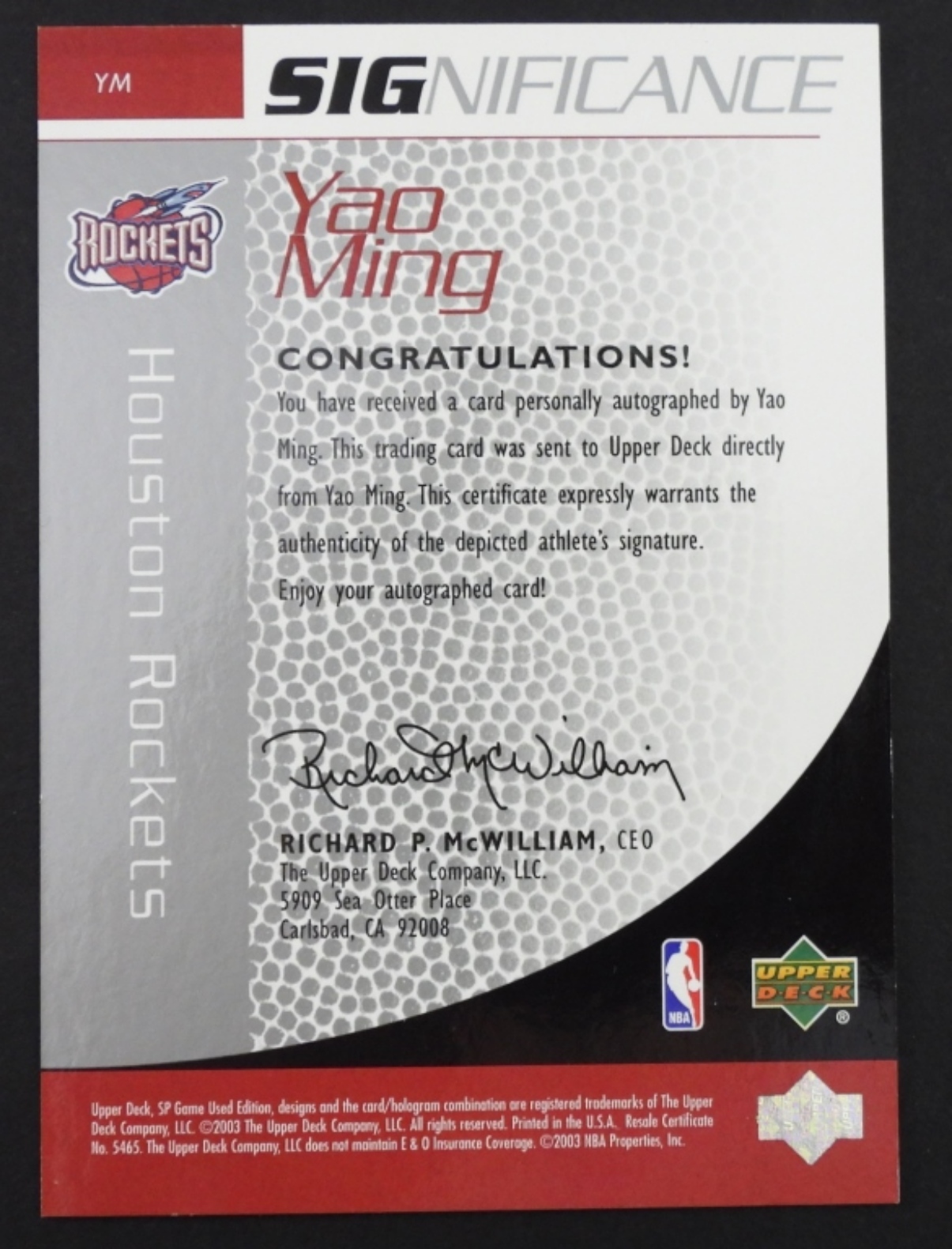 2003 UPPER DECK YAO MING ROCKETS,AUTOGRAPHED SIGNIFICANCE COLLECTORS CARD