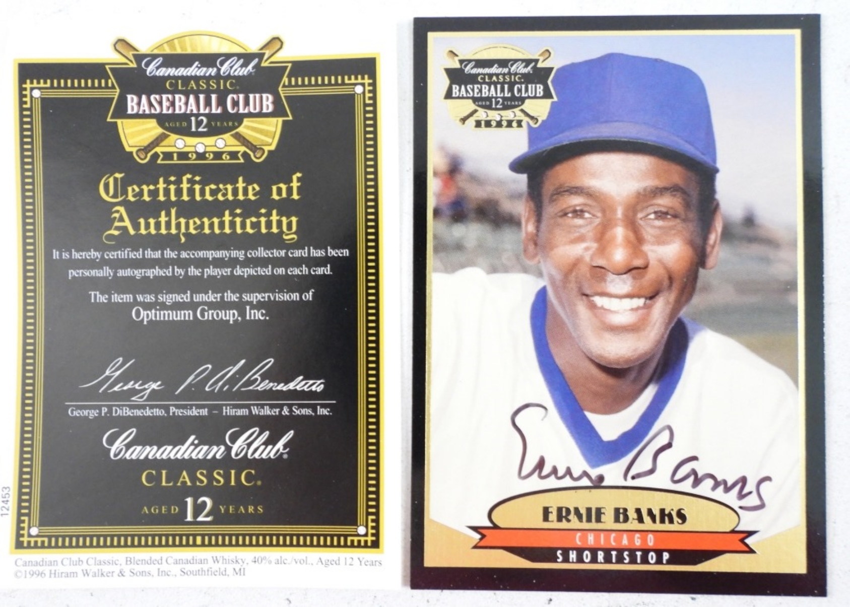 ERNIE BANKS SIGNED CANADIAN CLUB CARD with COA