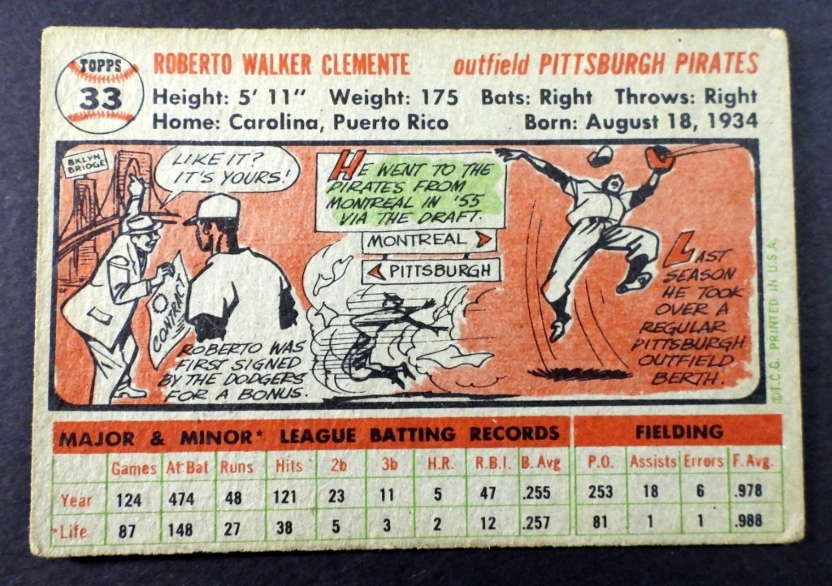 1956 TOPPS#33 ROBERTO CLEMENTE VG