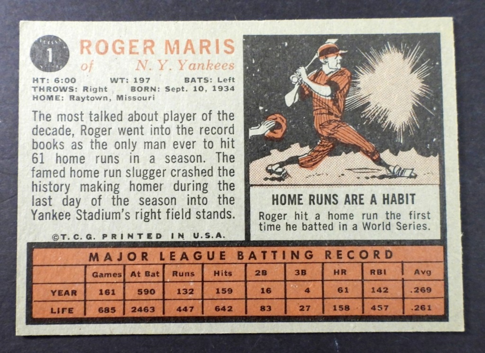 1962 TOPPS#1 ROGER MARRIS VG/EX+ “GREAT COLORING”