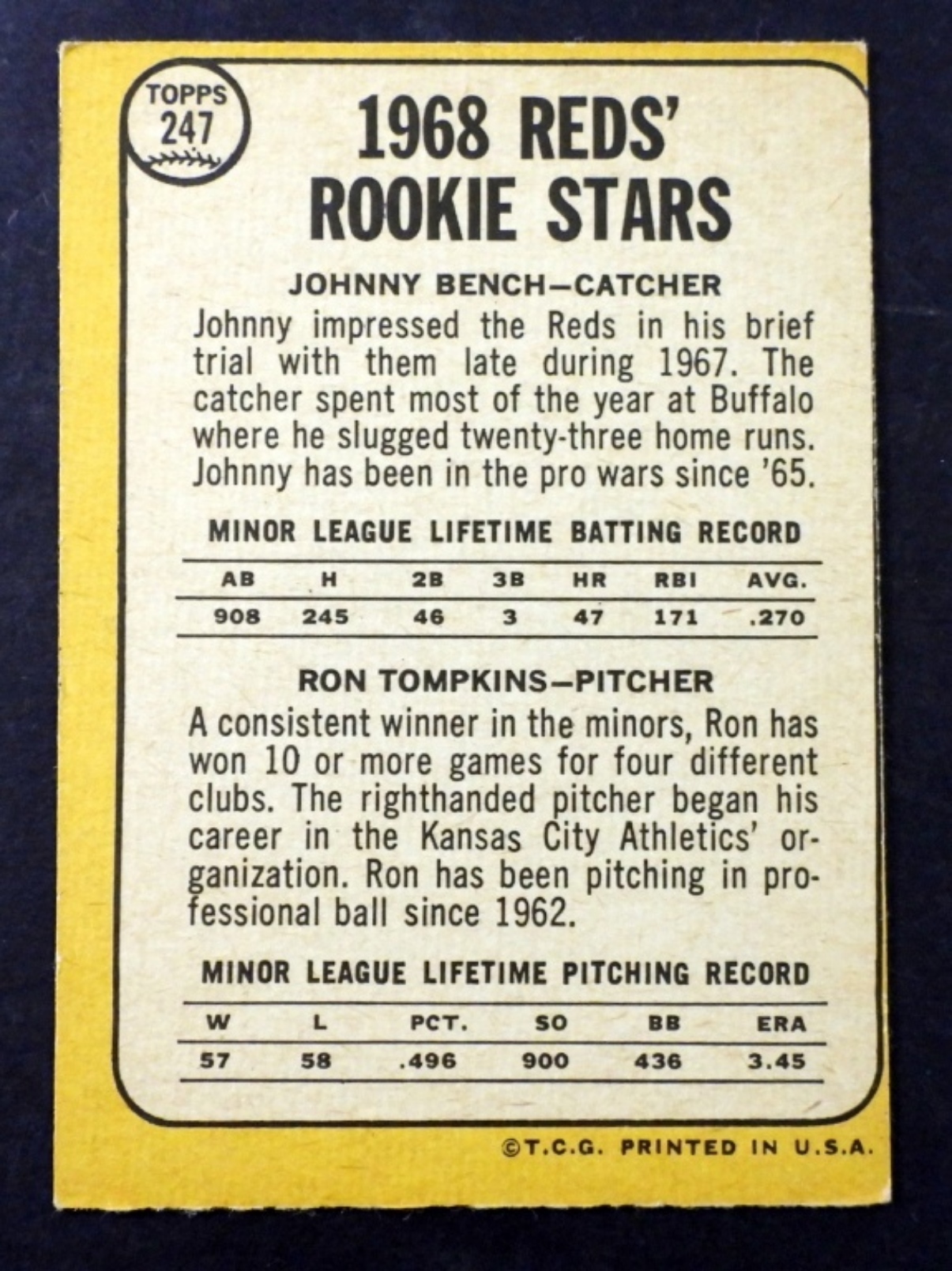 1968 TOPPS#247 JOHNNY BENCH ROOKIE VG/EX