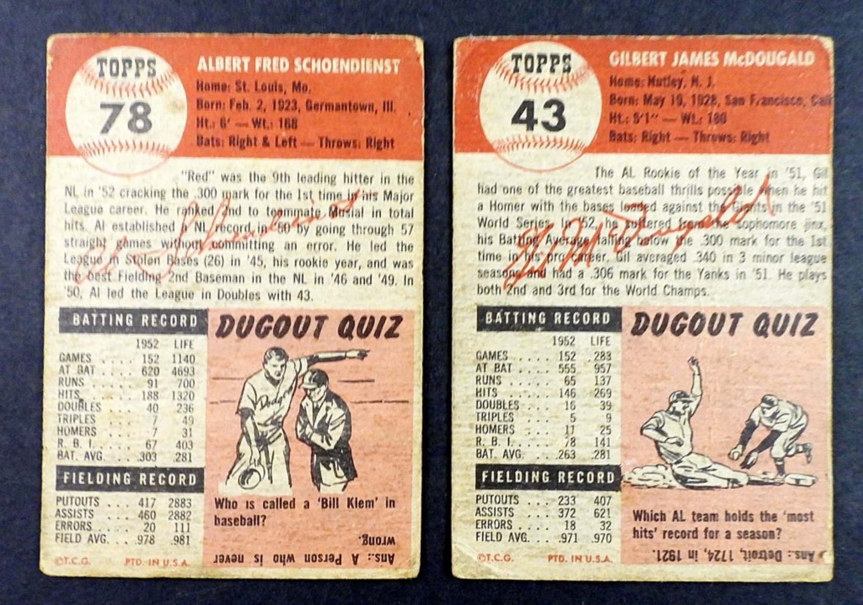 1953 TOPPS #78 AL SCHOENDIENST & #43 GIL MC DOUGALD VG