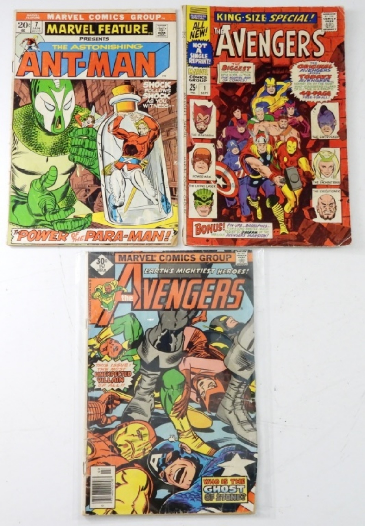 (3) MARVEL SILVER/BRONZE COMIC LOT,1972 MARVEL , ANT- MAN , #7 ASTONISHING ANT-MAN. 1967 MARVEL KING SIZE AVENGERS # 1 & 1977 MARVEL THE AVENGERS # 157 ,BLACK KNIGHTS 1ST APPEARANCE .( GOOD)