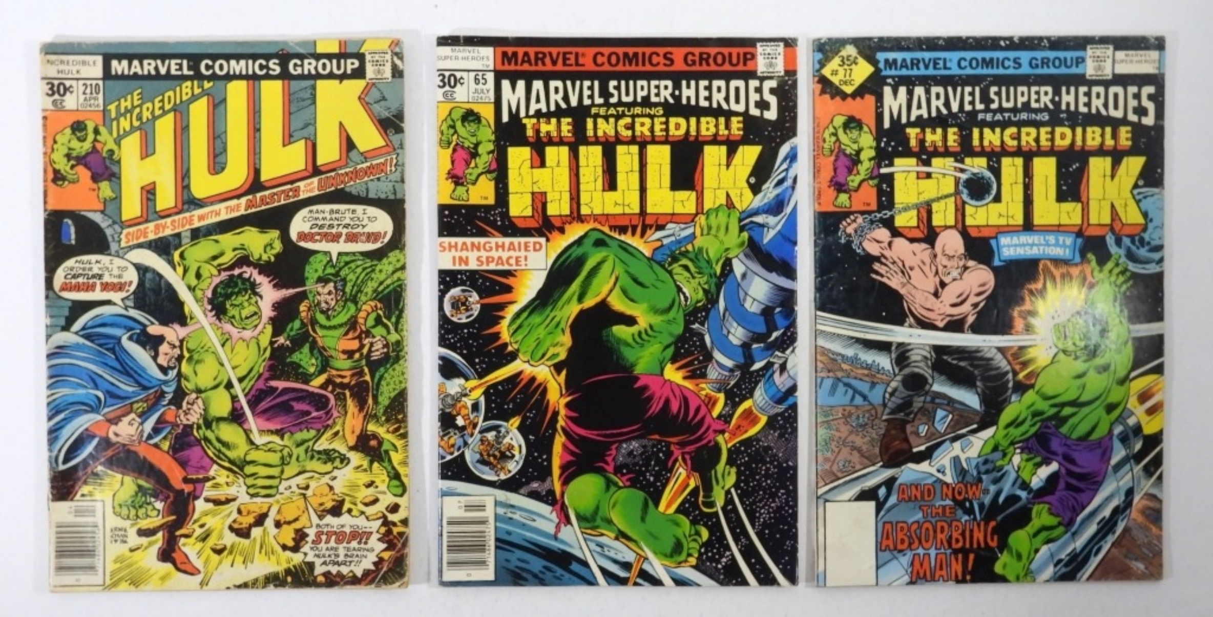 VG , 2-30C AND 1-35C , ISSUES MARVEL SUPER HEROES #65 AND 77 AND THE INCREDIBLE HULK #210