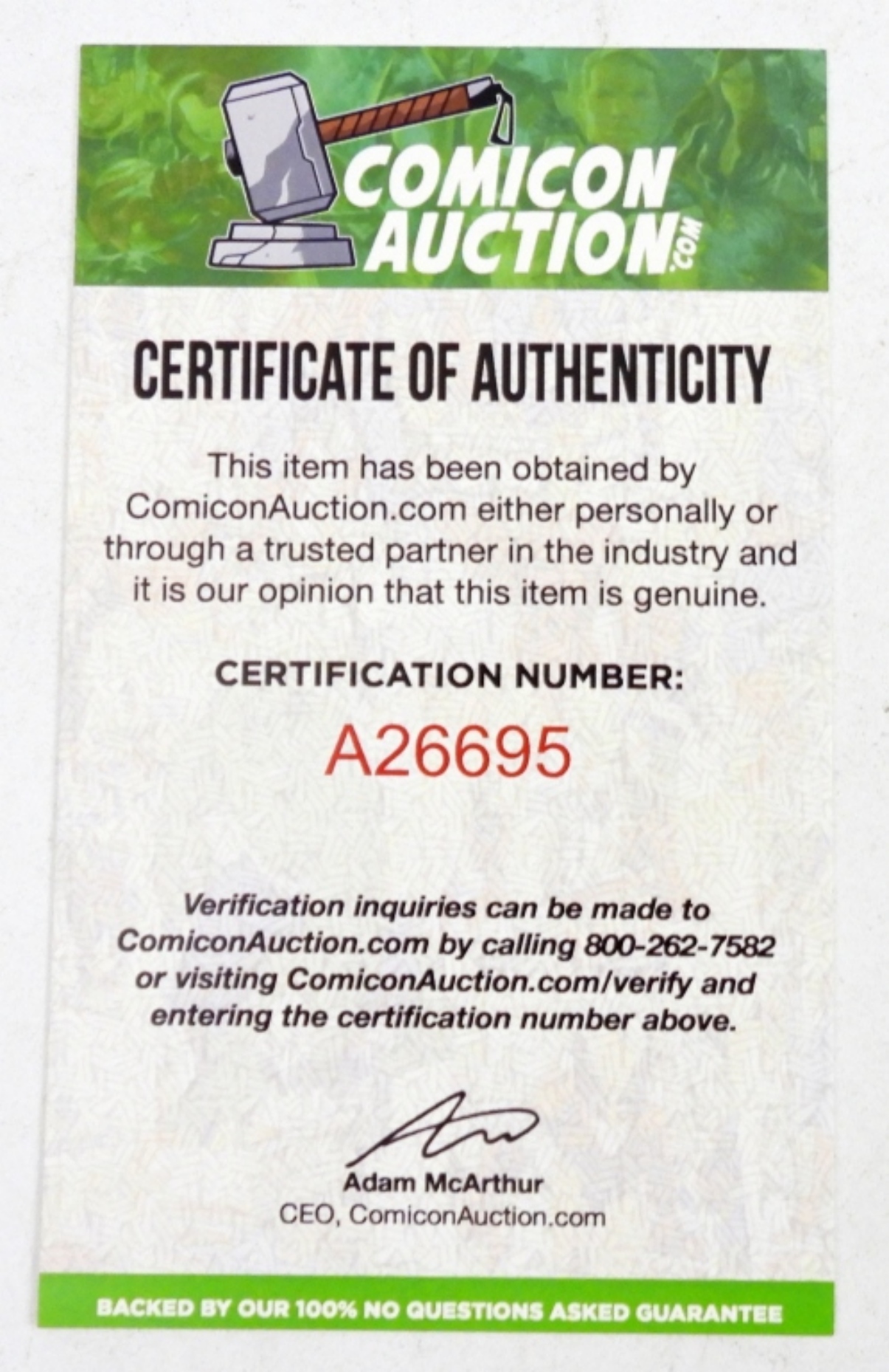 CERTIFICATE by COMICON AUCTION #A26695 – NM/MT