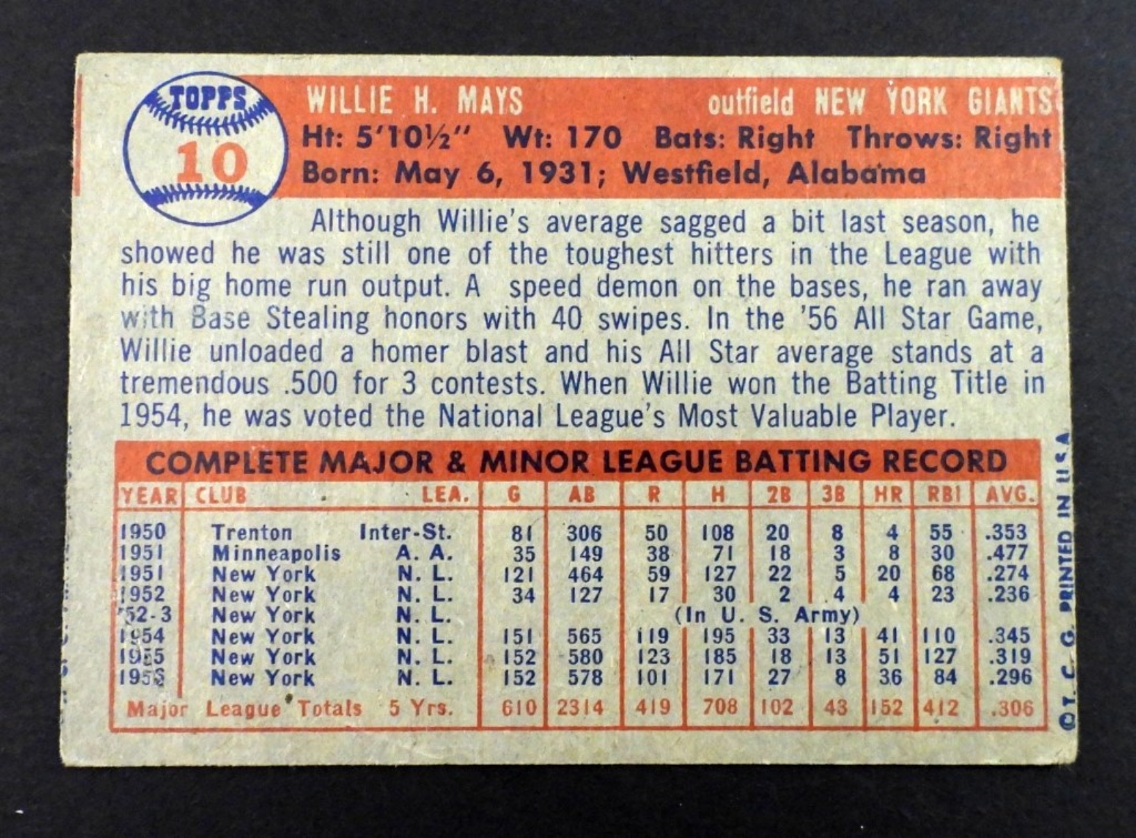 1957 TOPPS #10 WILLIE MAYS, NEW YORK GIANTS, VG