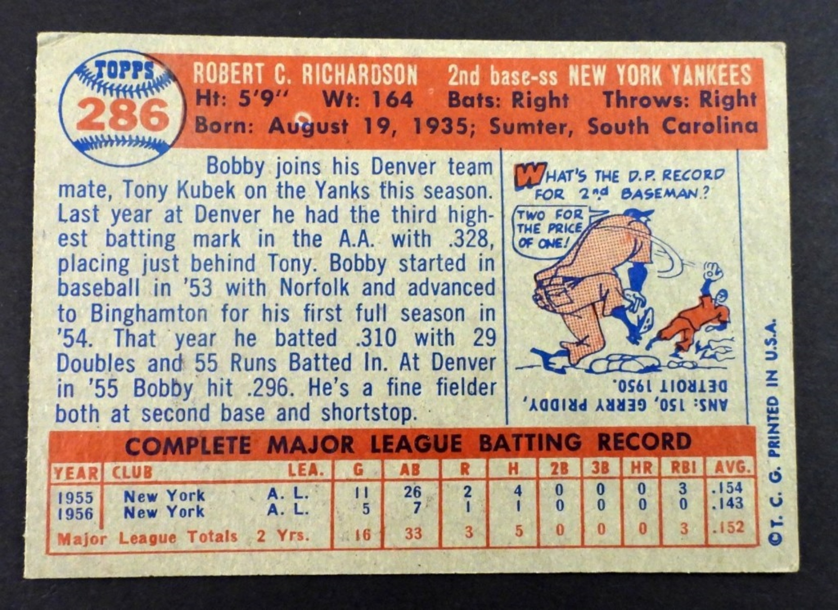 1957 TOPPS #286 BOBBY RICHARDSON ROOKIE CARD ,NEW YORK YANKEES,VG