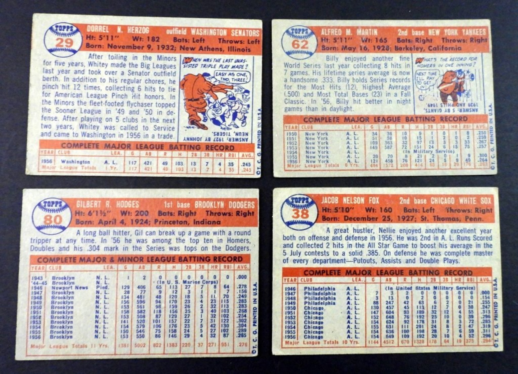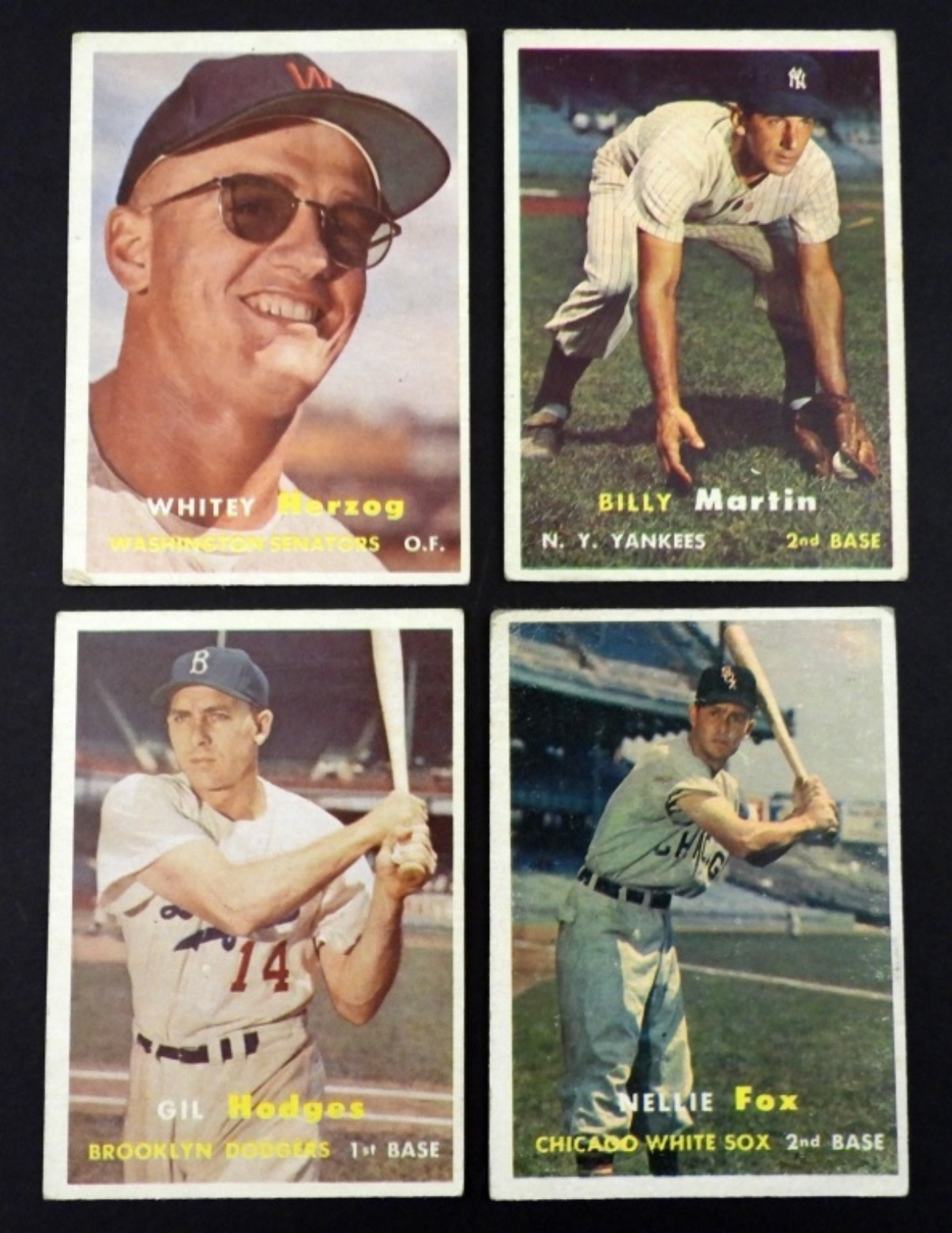 (4)1957 TOPPS BASEBALL CARDS G/VG# 80 GIL HODGES,#62 BILLY MARTIN,329WHITEY HERZOG # 38 NELLIE FOX