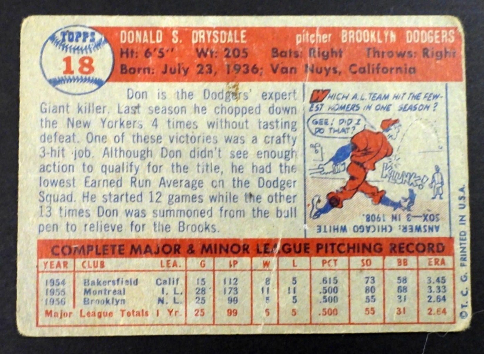 1957 TOPPS DON DRYSDALE ROOKIE BROOKLYN DODGERS,VG