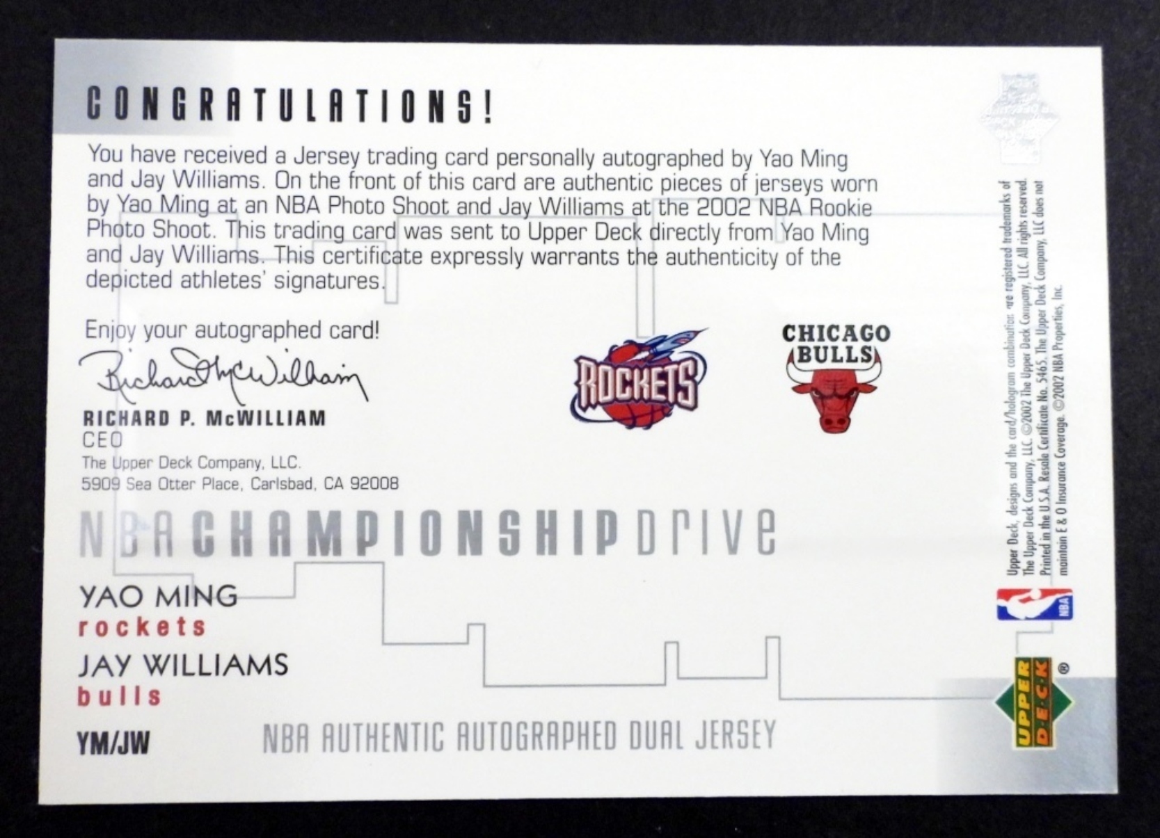 UPPER DECK YAO MING & JAY WILLIAMS NBA AUTOGRAPHED DUAL JERSETYCARD
