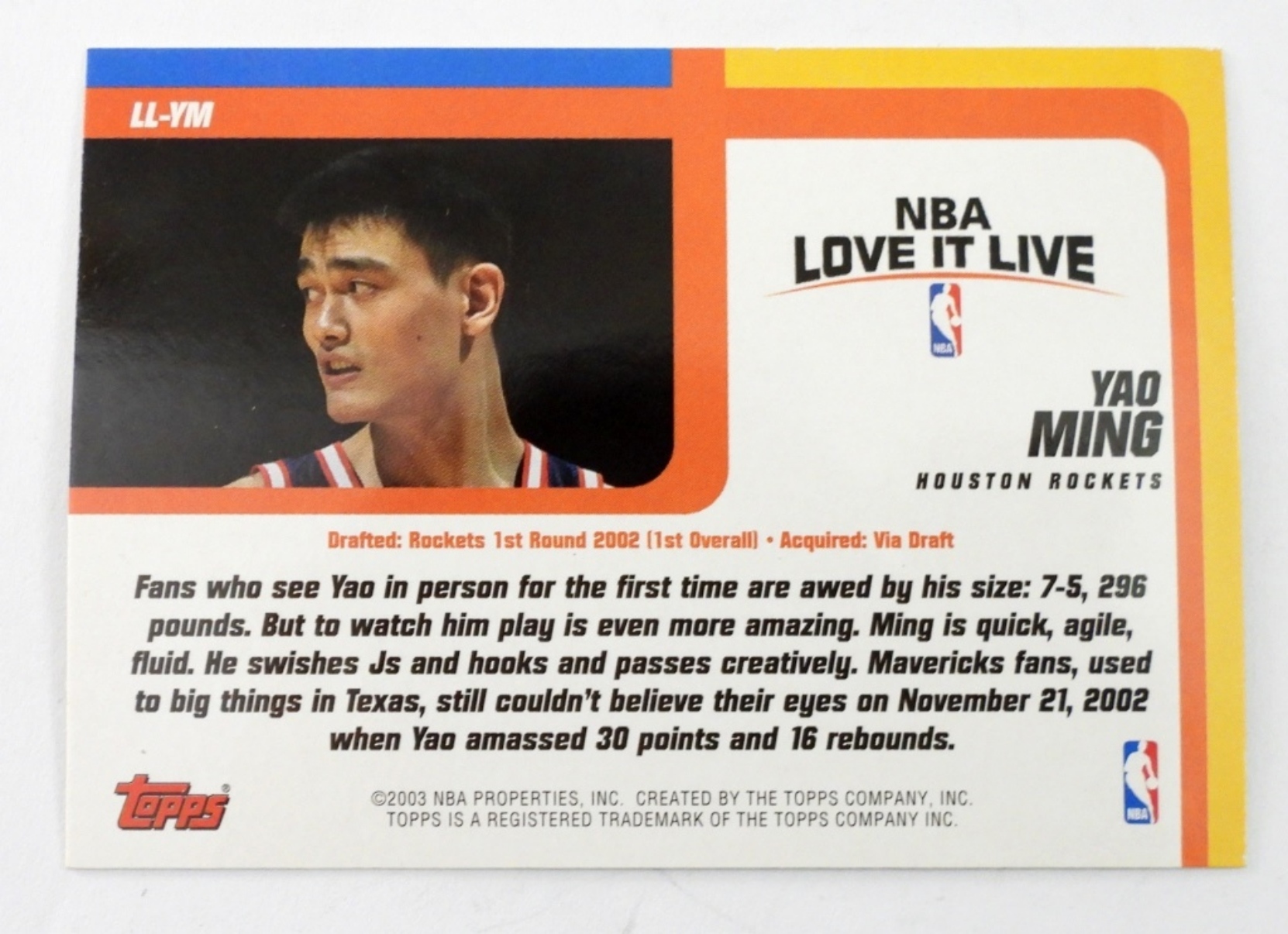 TOPPS 2002-2003 YAO MING NBA LOVE IT LOVE COLLECTABLE BASKETBALL ( HOLAGRAM) CARD