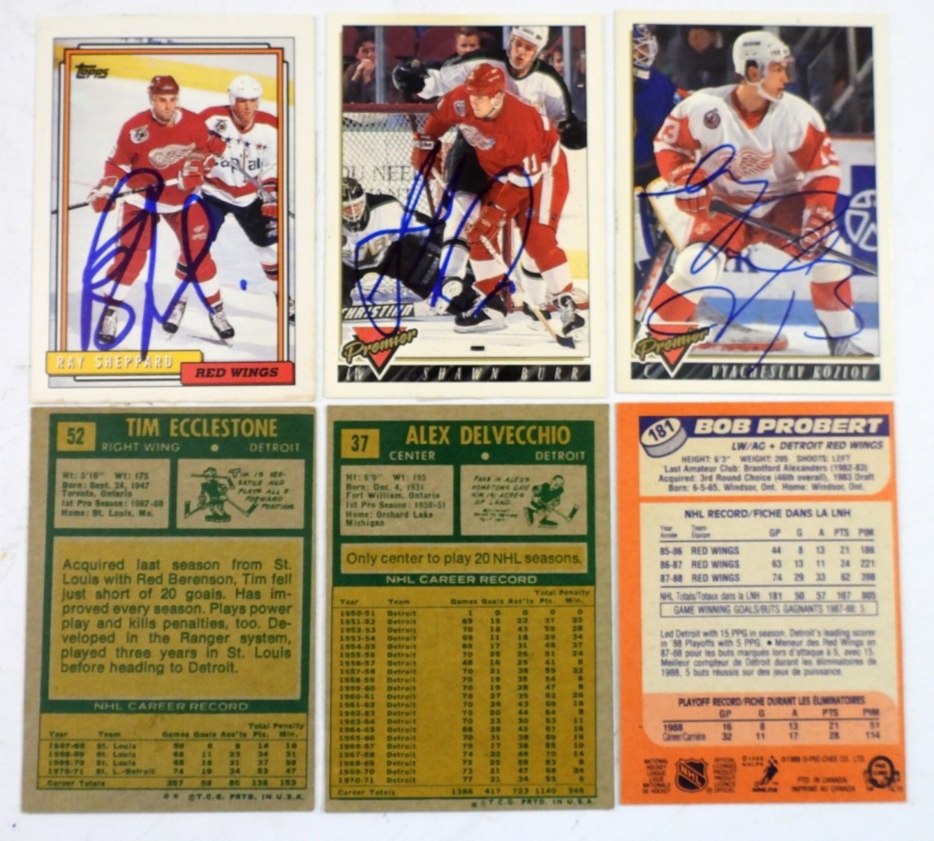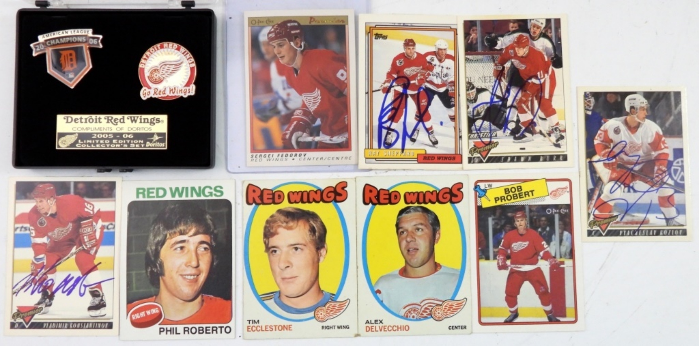 (4) AUTOGRAPHED RED WINGS CARDS. (5) RED WINGS CARDS with 1990/91 OPC FEDOROV #30 ROOKIE