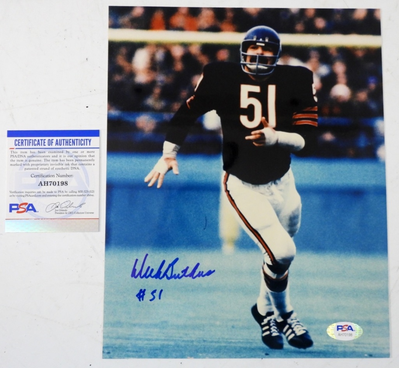 DICK BUTKIS # 51, SIGNED CHICAGO BEARS 8X10 PHOTO , PSA AUTHENTICATED