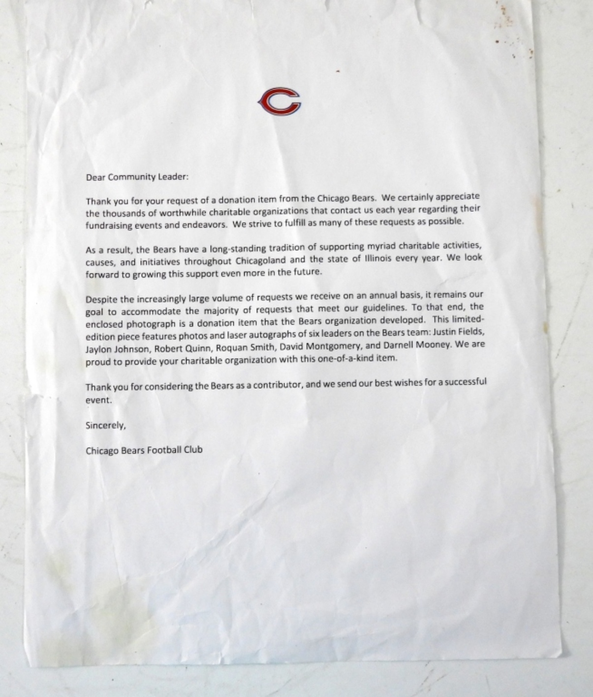 8X10 CHICAGO BEARS PHOTO LASER AUTOGRAPHED OF 6 LEADERS ON THE BEARS TEAM,w LETTER FROM CHICAGO BEARS FOOTBALL CLUB.