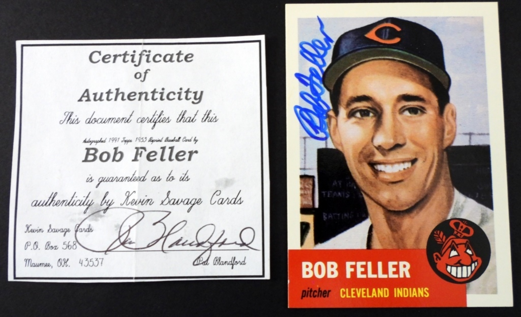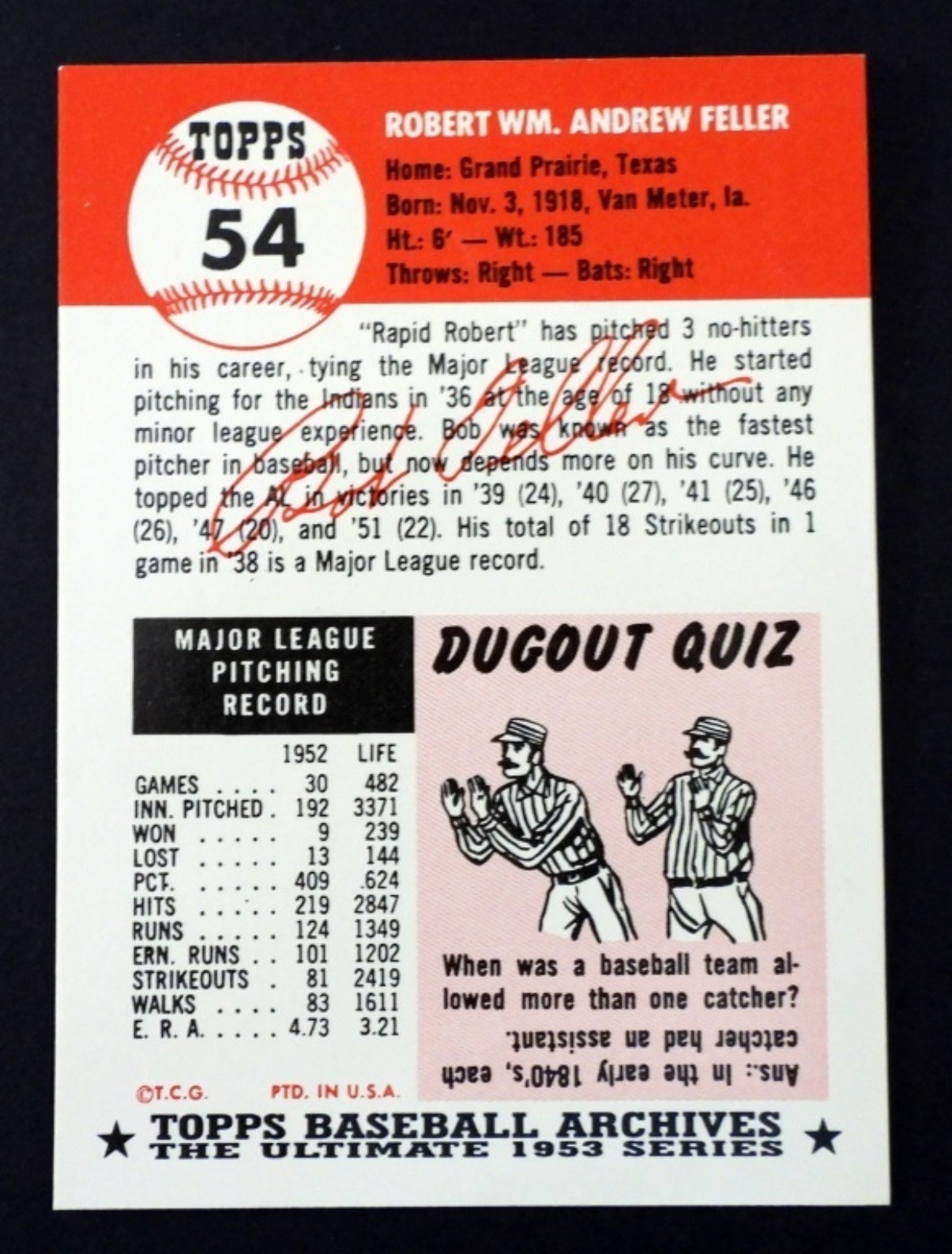 1953 TOPPS ARCHIVES #54 BOB FELLER CARDw COA