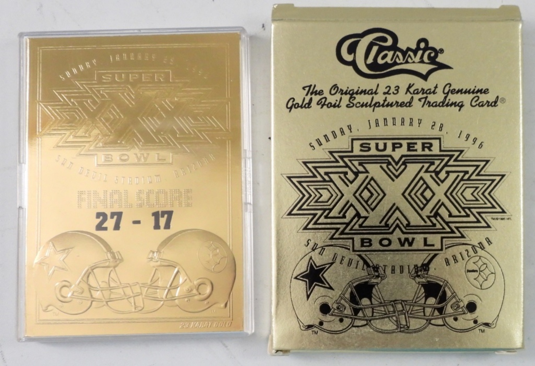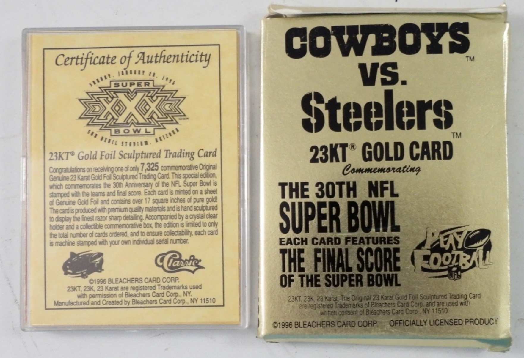 FROM CLASSIC THE ORIGINAL 23 KART GENUINE GOLD FOIL SCULPTURED TRADING CARD, COWBOYS VS STEELERS, ONLY 7,325 MADE WITH CLASSIC OWN COA, IN ORGINAL BOX LITTLE DENTED ON ONE SIDE