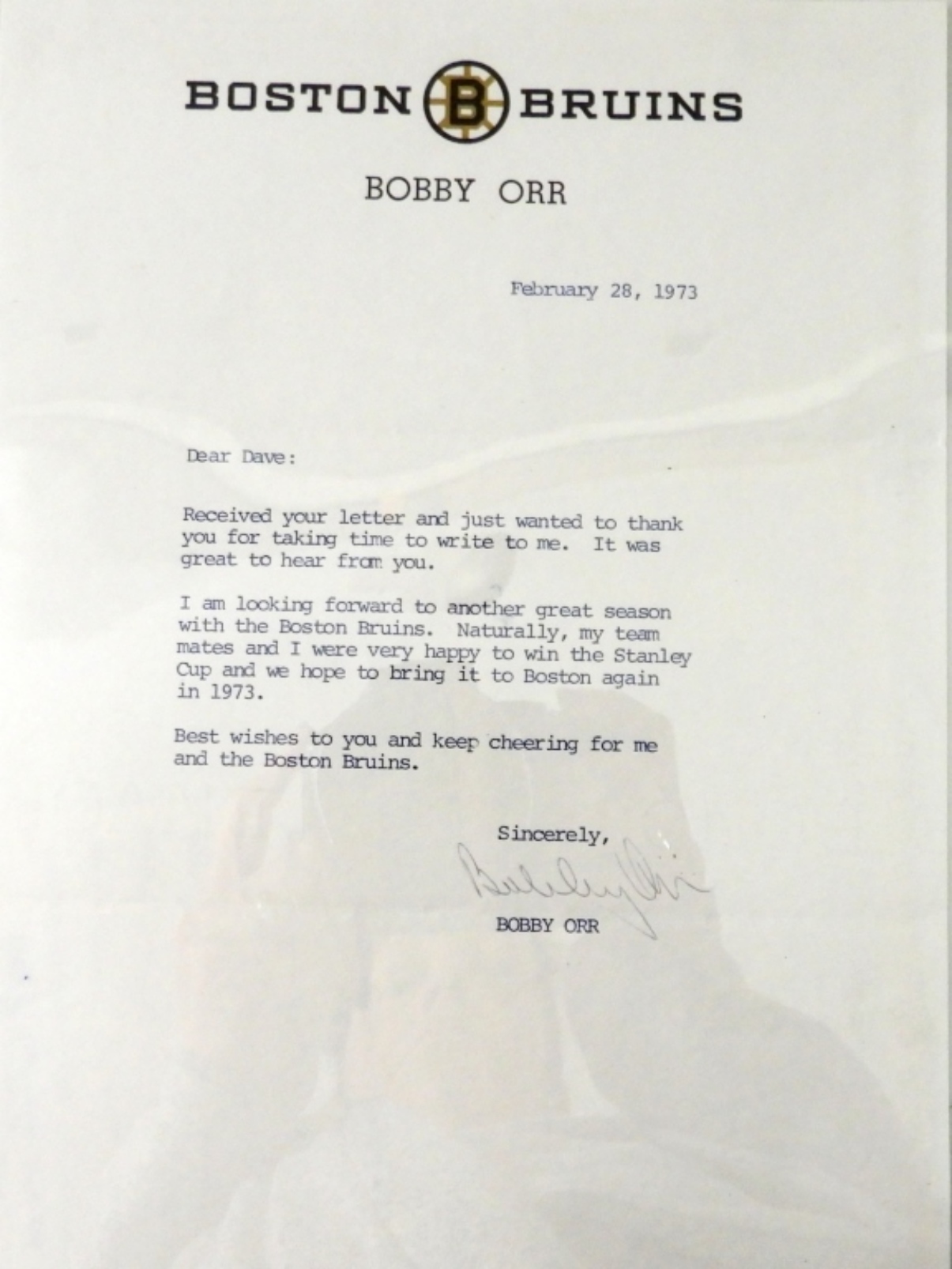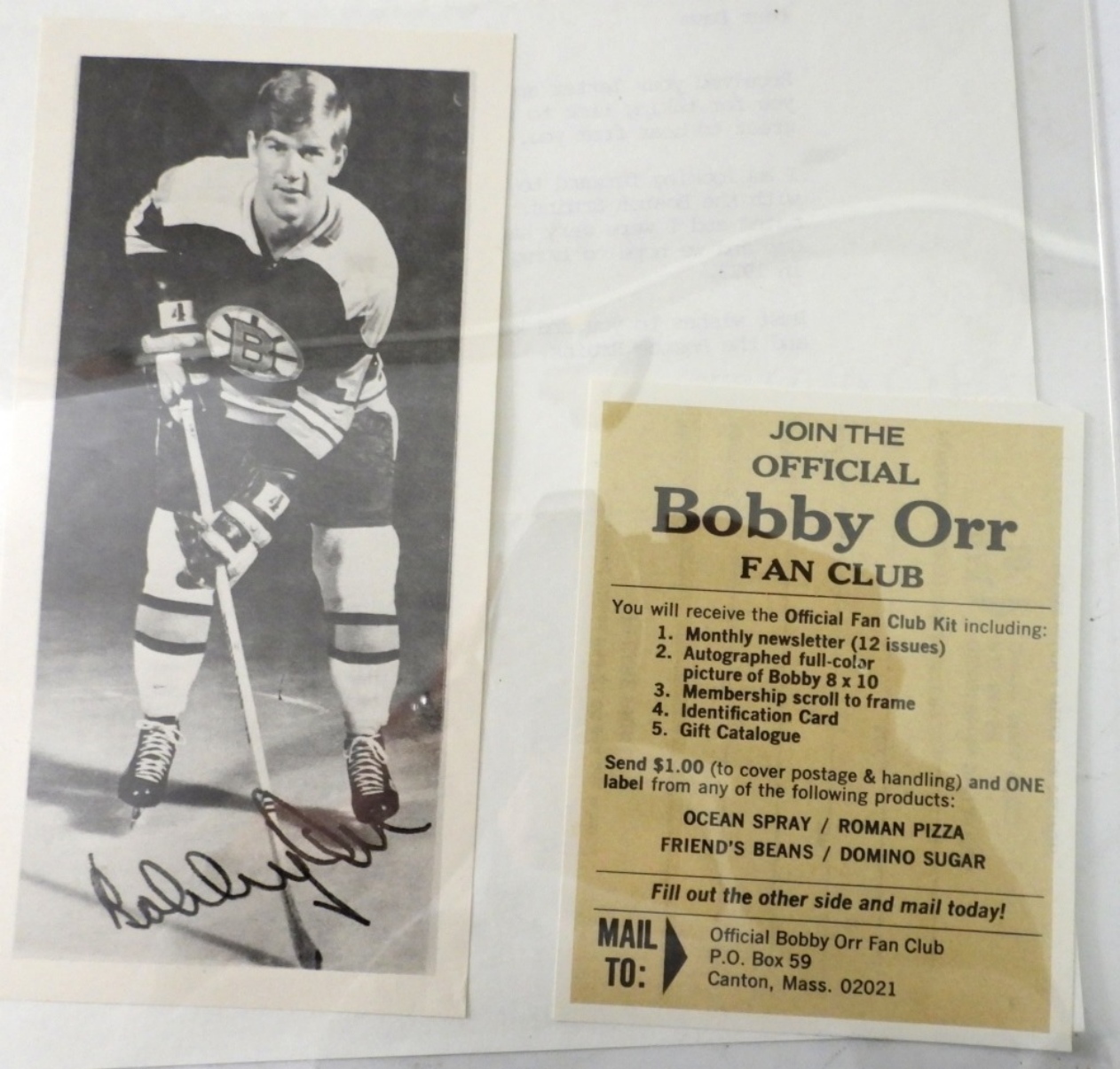 1973 AUTOGRAPH BOBBY ORR PICTURE & FAN CLUN LETTER ON BOSTON BRUINS , BOBBY ORR LETTER HEAD