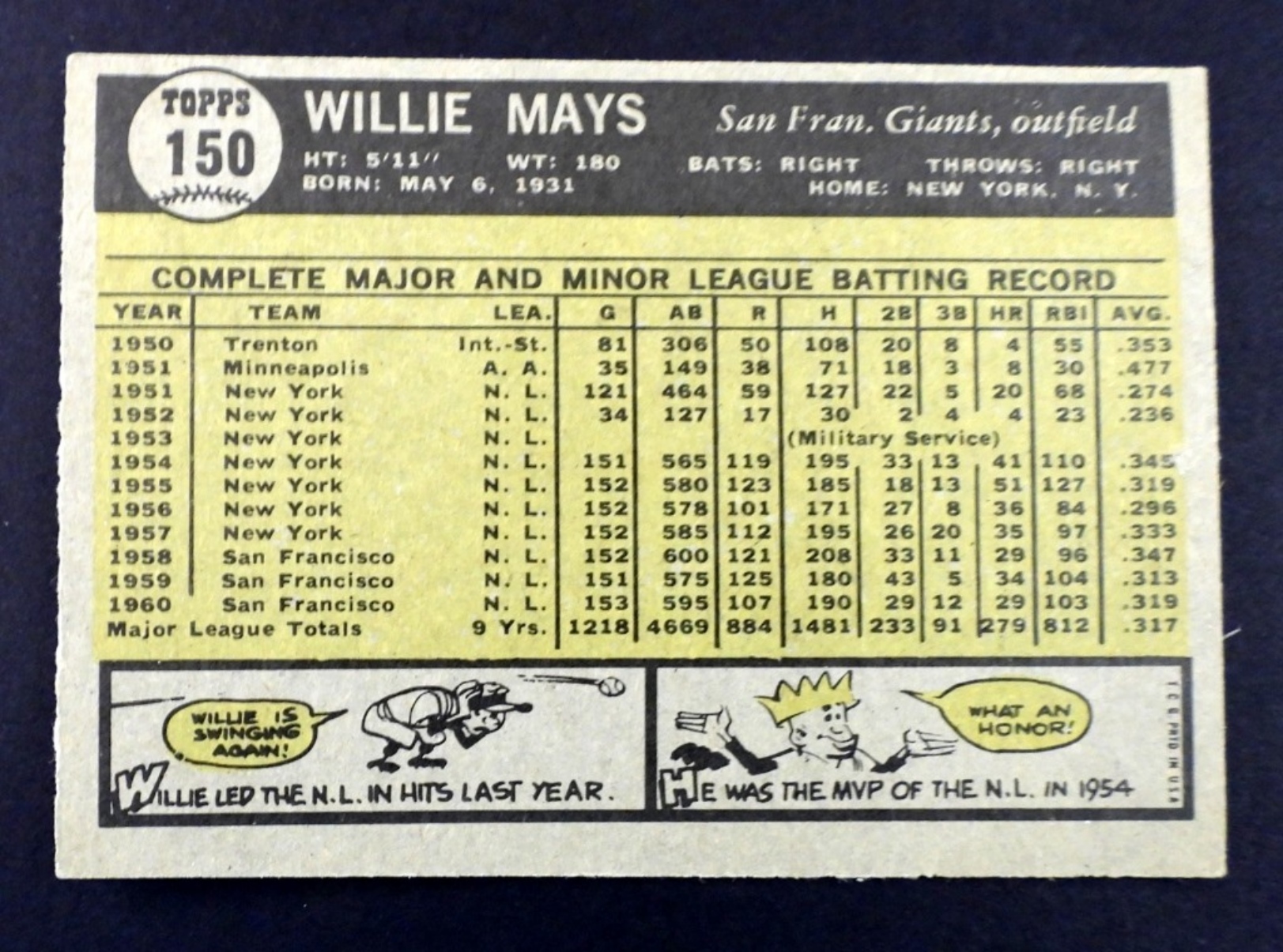 1961 TOPPS #150 WILLIE MAYS VG/EX