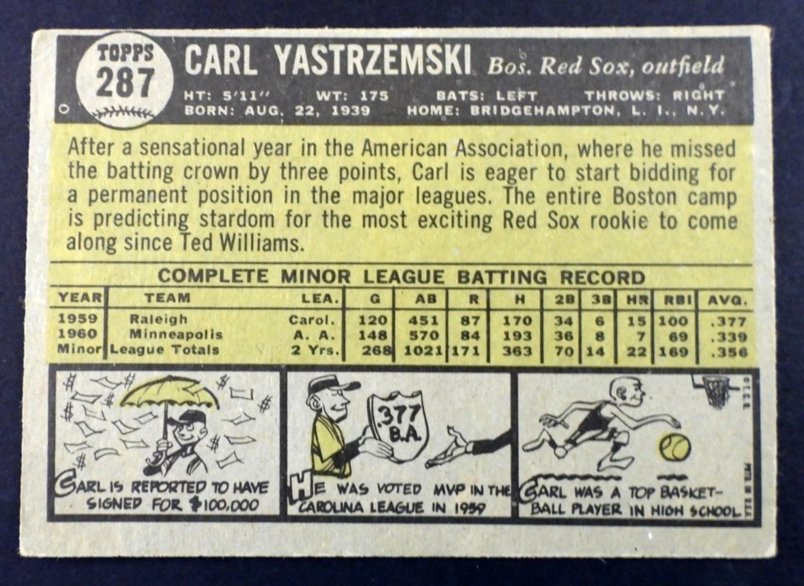 1961 TOPPS#287 CARL YASTRZEMSKI ROOKIE, NICE COLOR! VG/EX