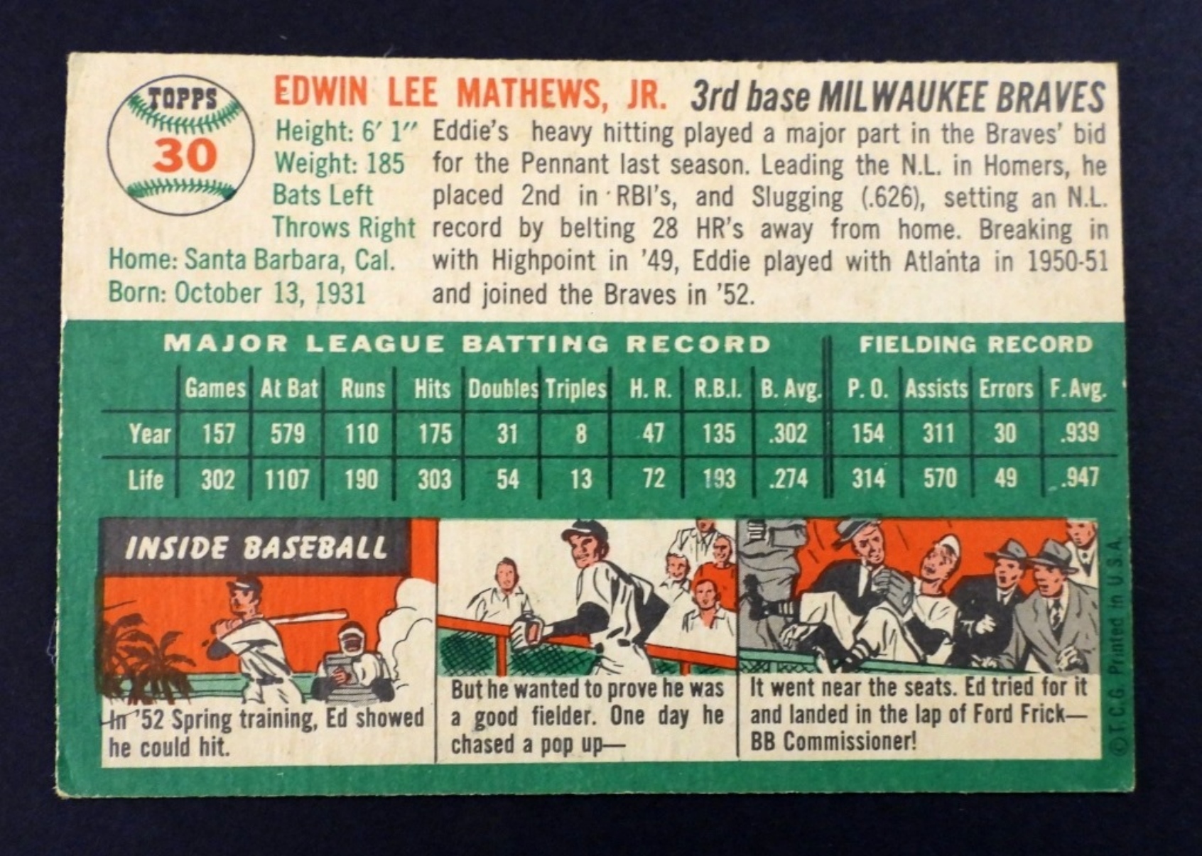 1954 TOPPS# 30 EDDIE MATHEWS VG/EX