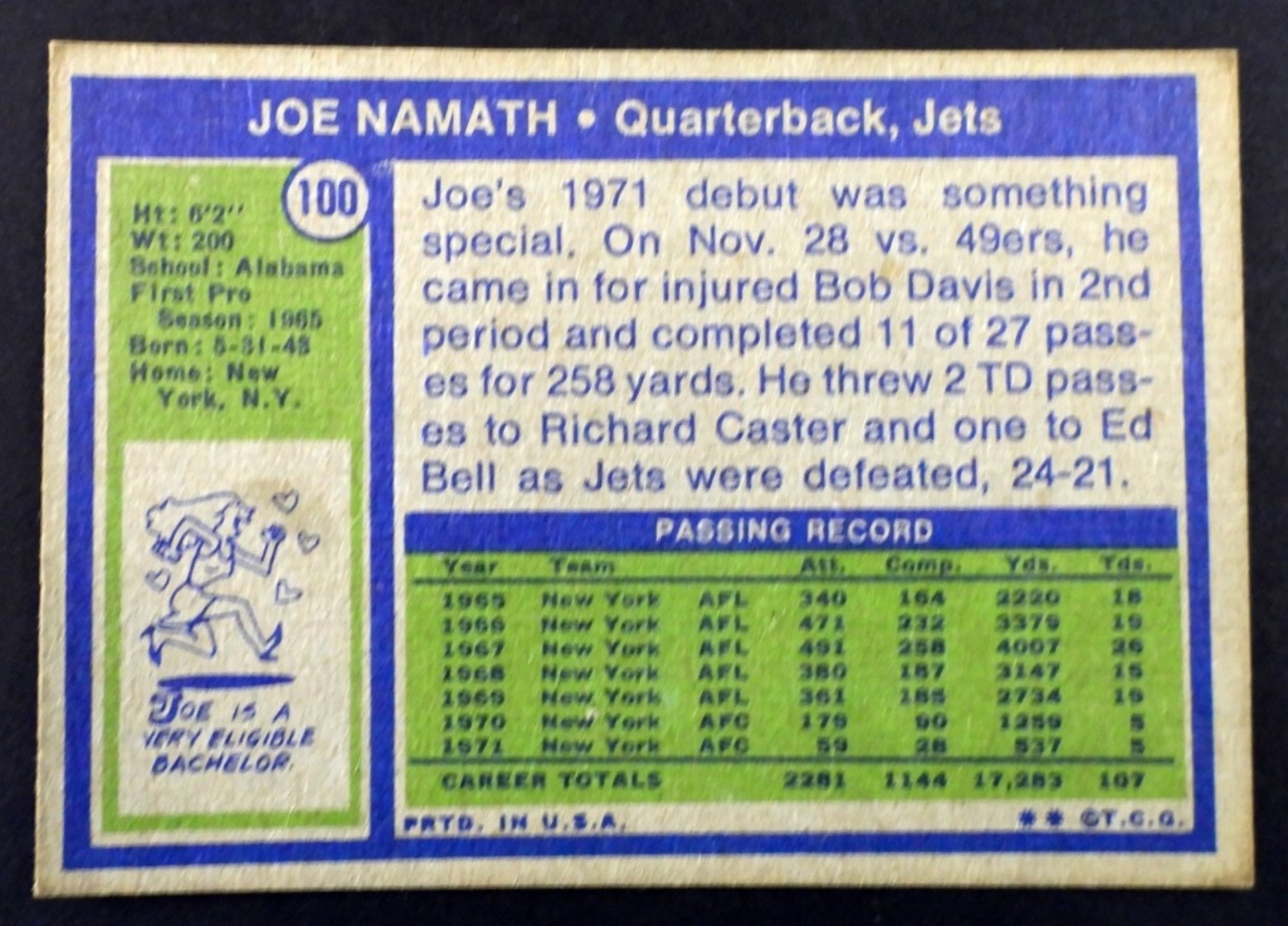1972 TOPS#100 JOE NAMATH JETS VG/EX