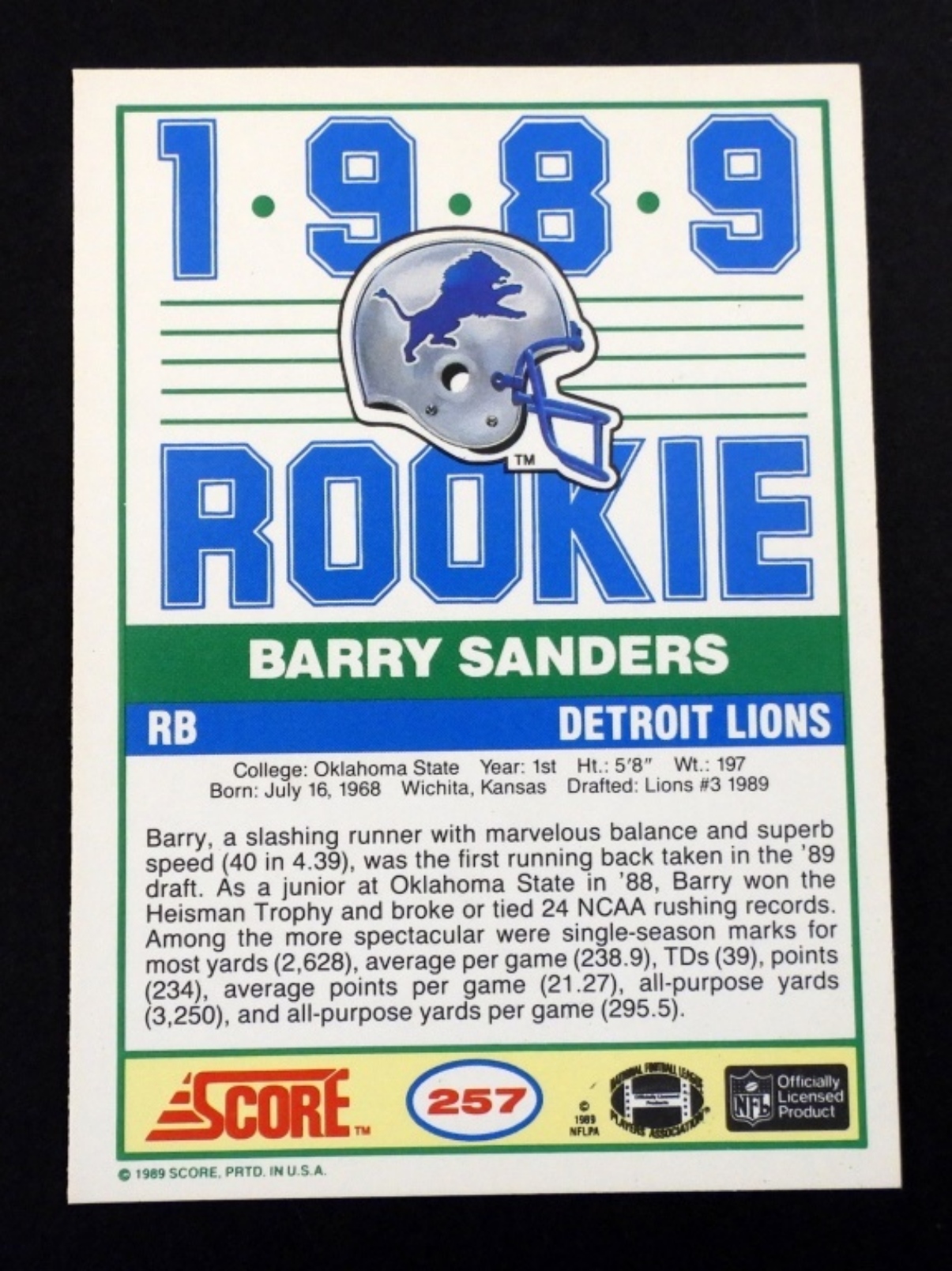 1989 SCORE#257 BARRY SANDERS ROOKIE EX/NM+