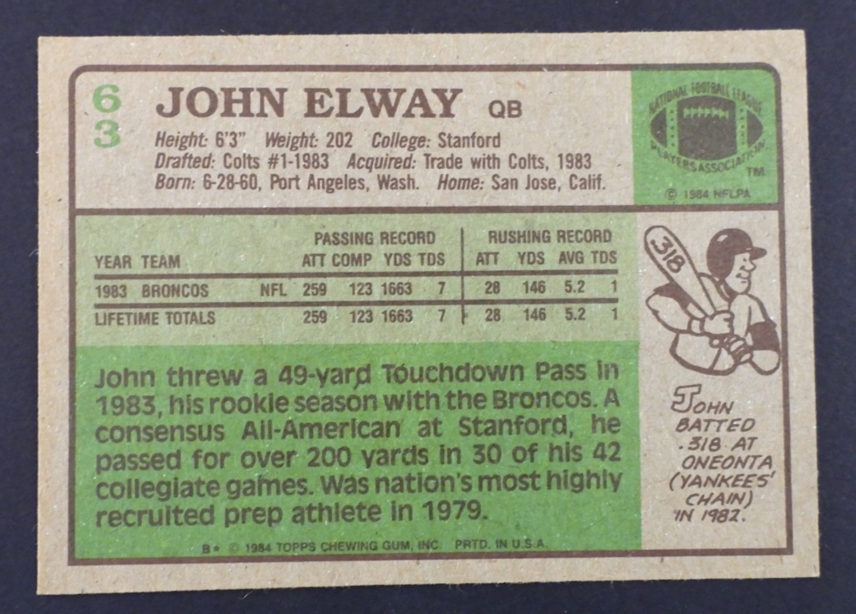1984 TOPPS#63 JOHN ELWAY ROOKIE, BRONCOS VG/EX+