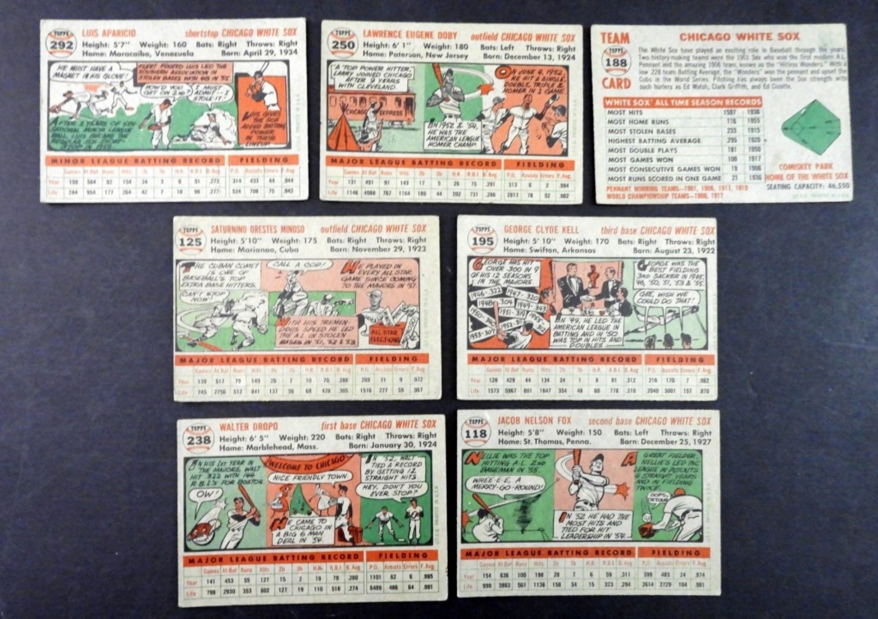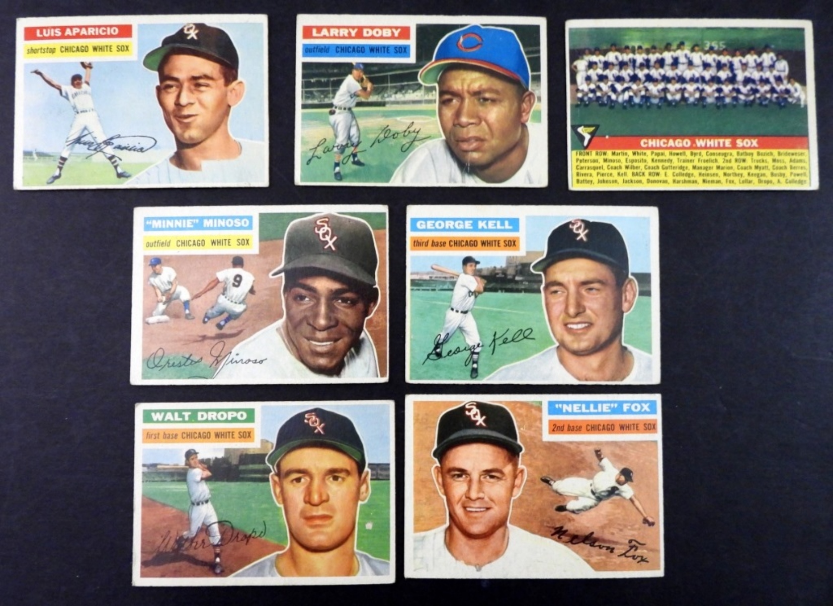 (7) 1956 TOPPS CHICAGO WHITE SOX LOT VG/EX,# 250 LARRY DOBY,#292 LUIS APARICIO,# 188 TEAM CARD & MORE
