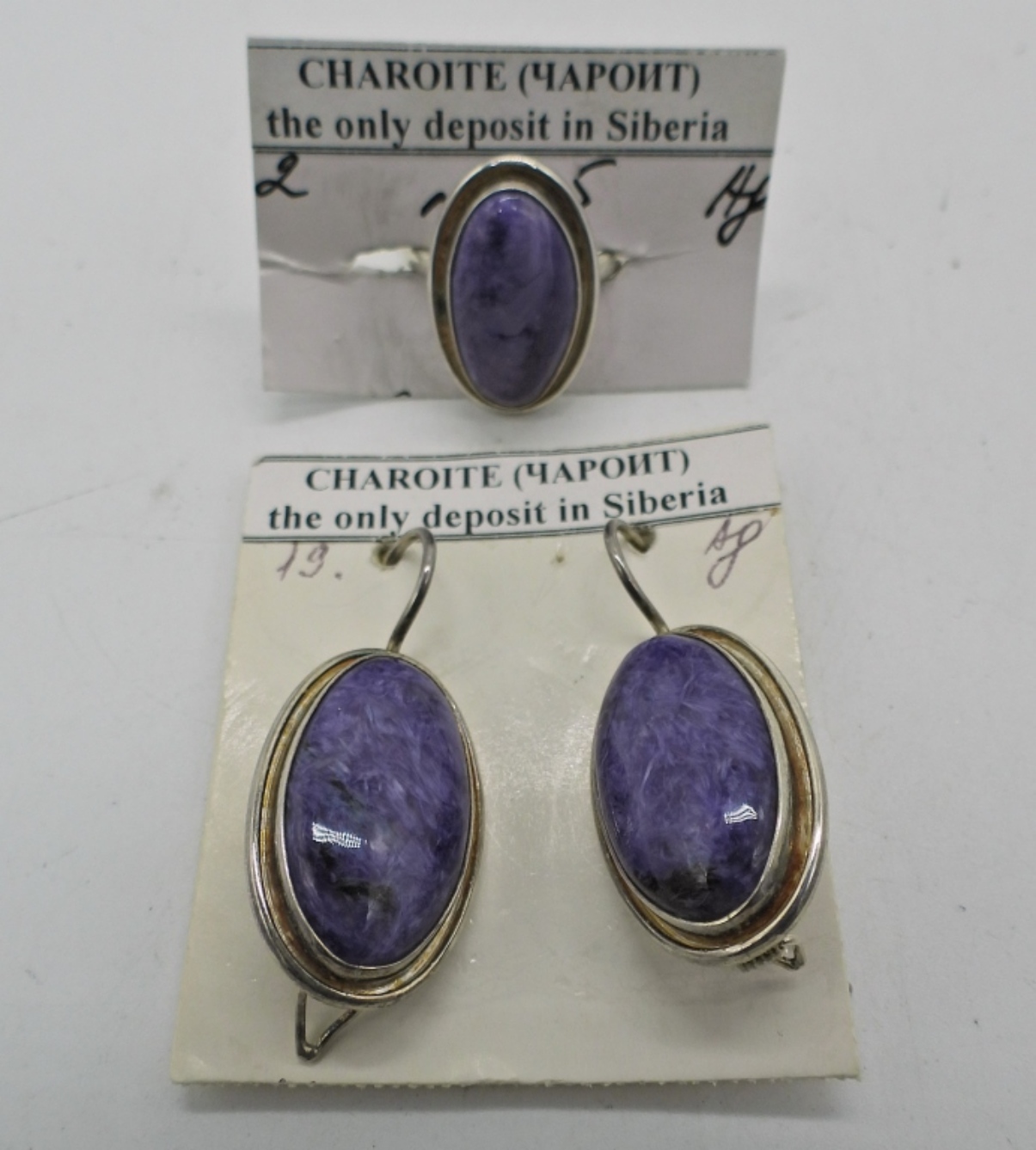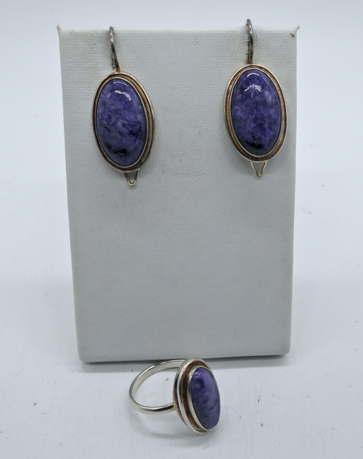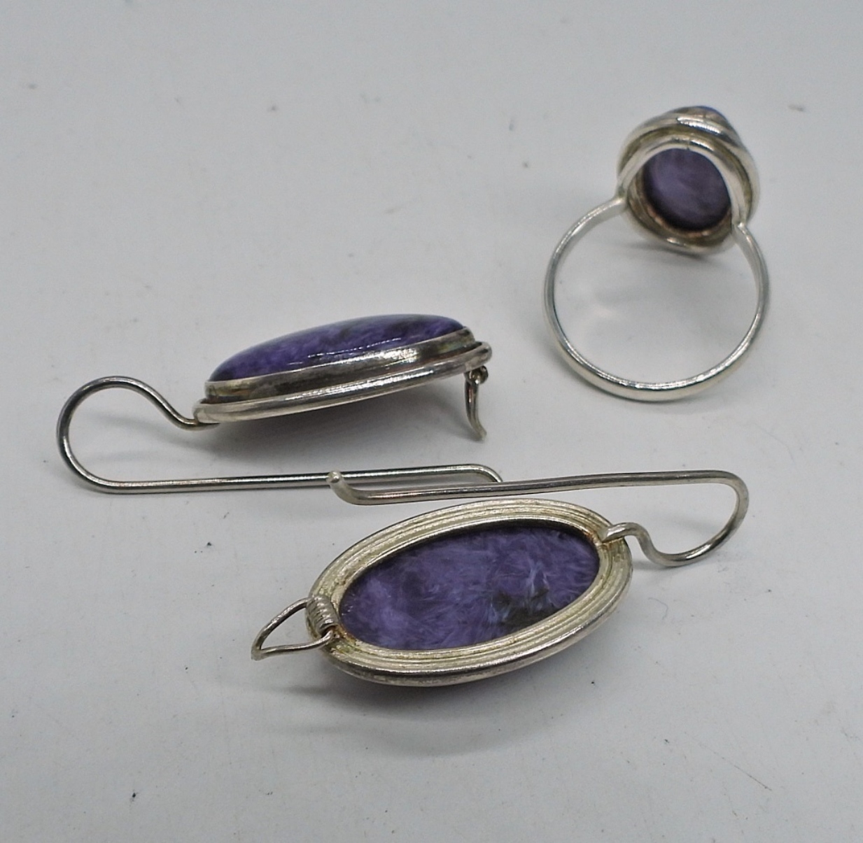 STERLING SILVER PIERCED EARRINGS AND RING. CHAROITE GEMSTONES. RING SIZE 7.5 8.3 DWT