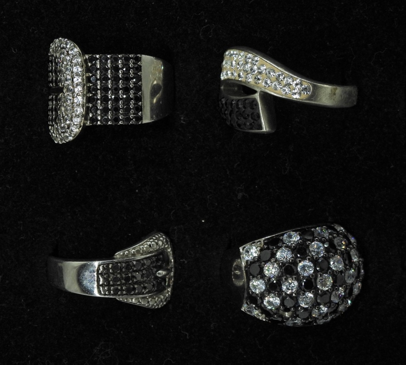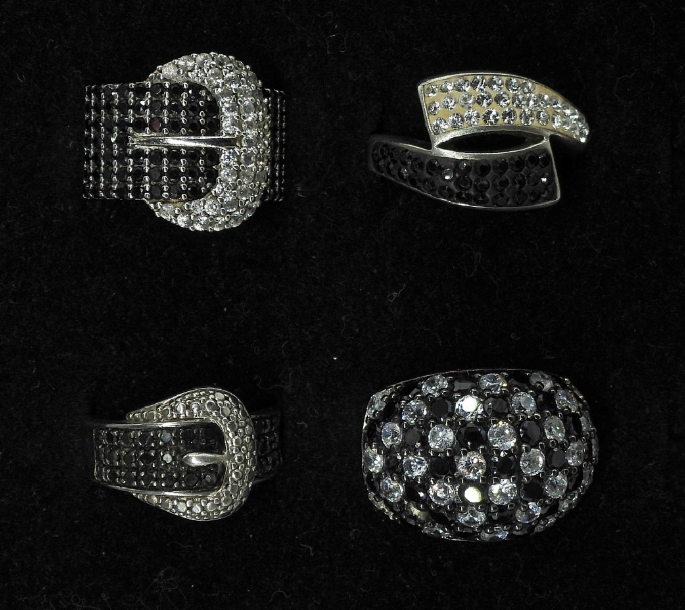 FOUR STERLING SILVER RINGS WITH BLACK AND WHITE GEMSTONES (NONE OF THESE ARE DIAMONDS). SIZES 6 & 7. 15.8 DWT