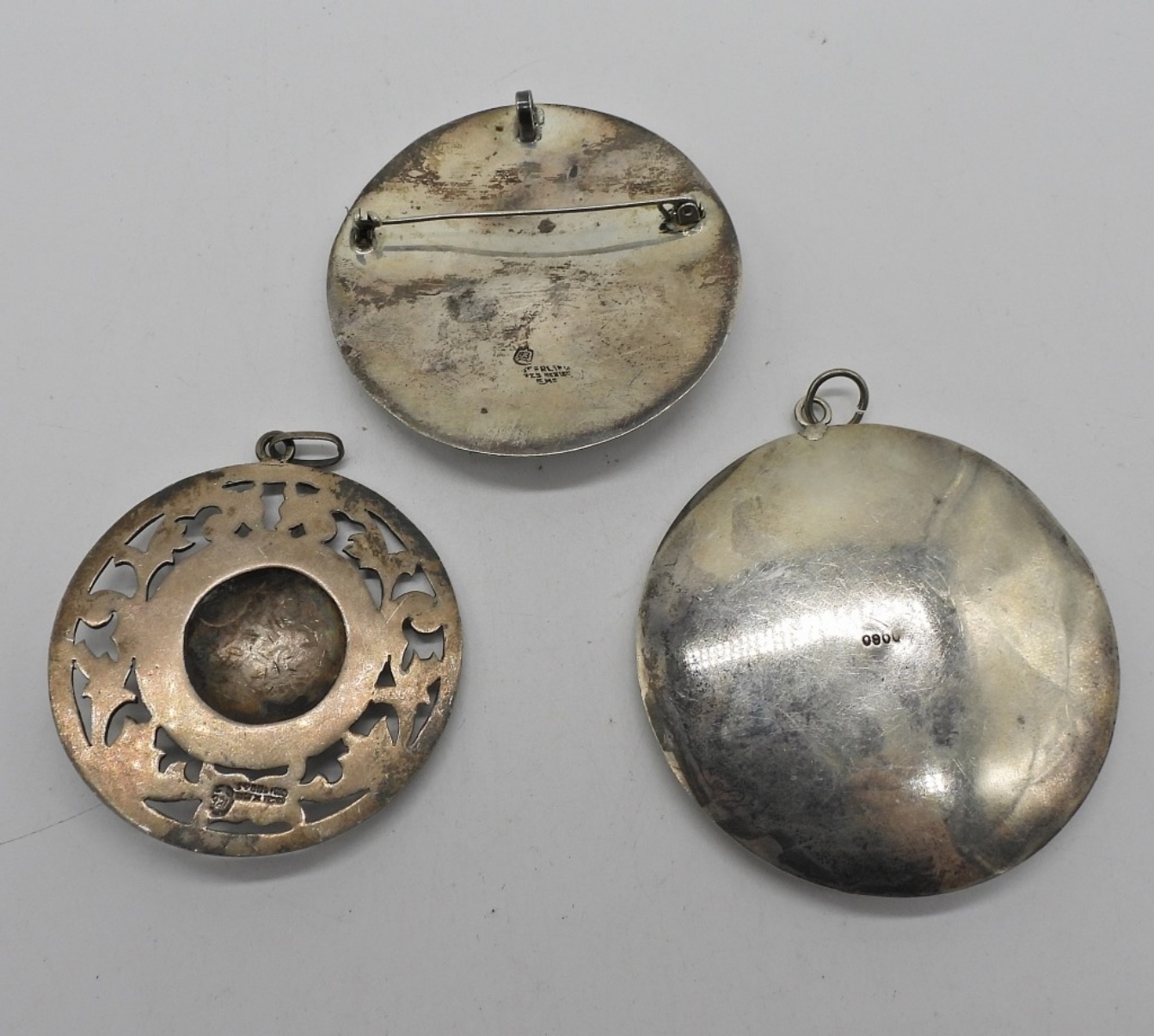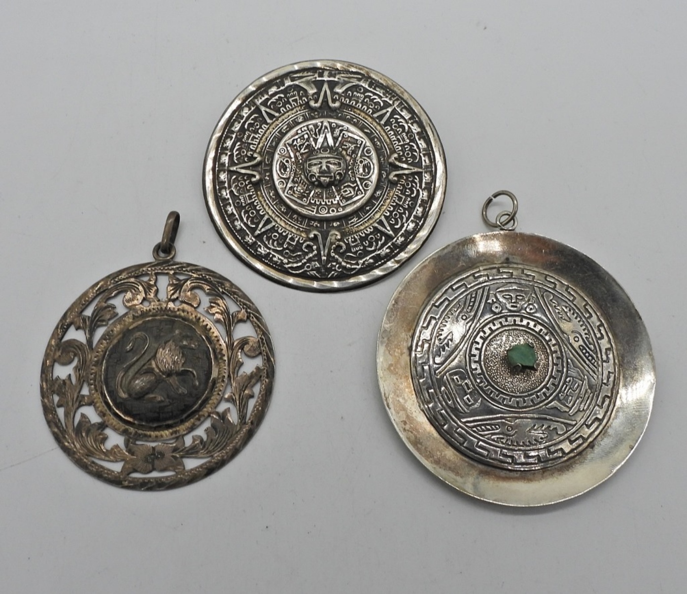 VINTAGE PERUVIAN PENDANT WITH RAW EMERALD CHUNK, MARKED 900 (NOT STERLING). TWO MEXICO 925 PENDANTS. MEASURE BETWEEN 2-2.5″. 35 DWT
