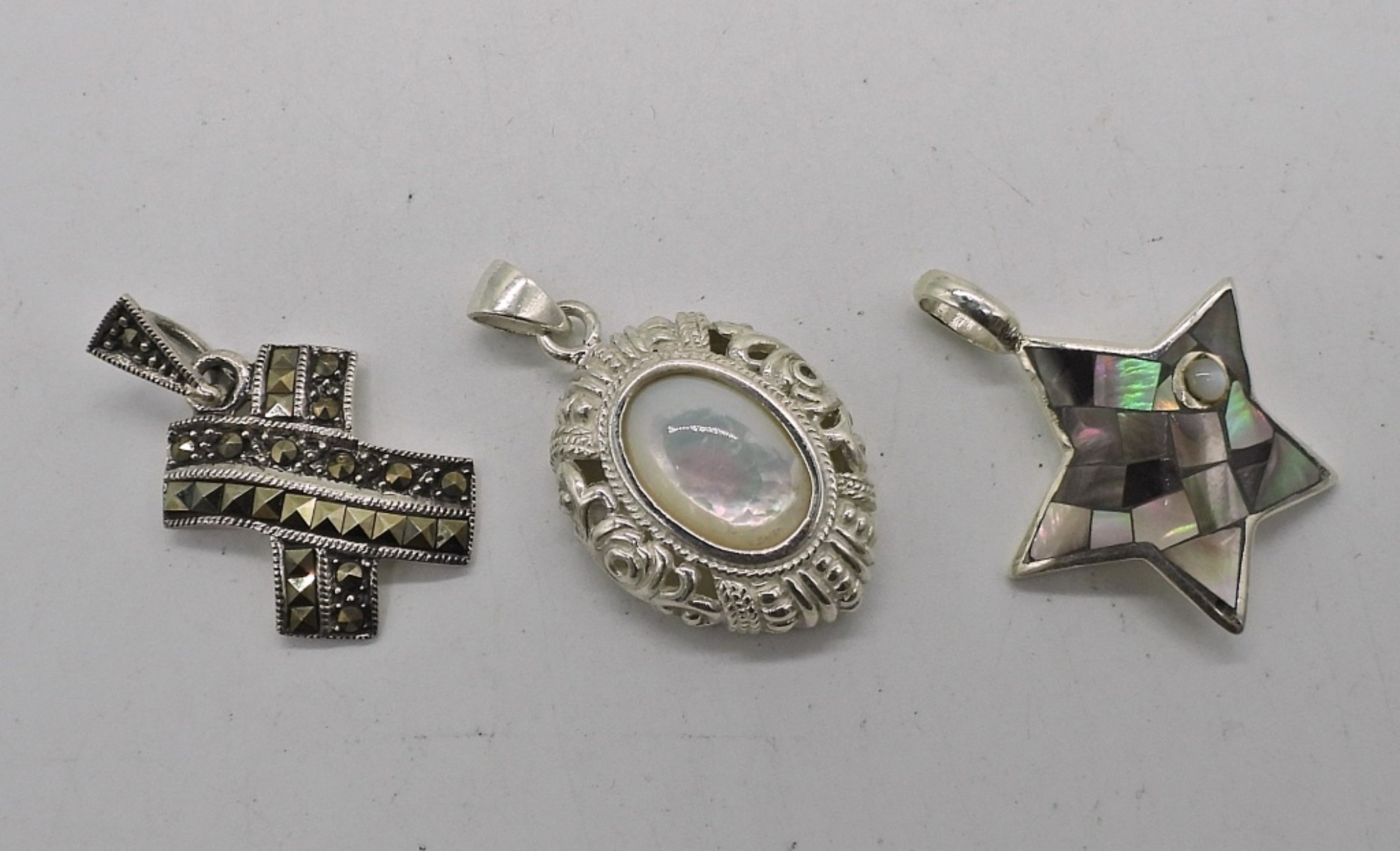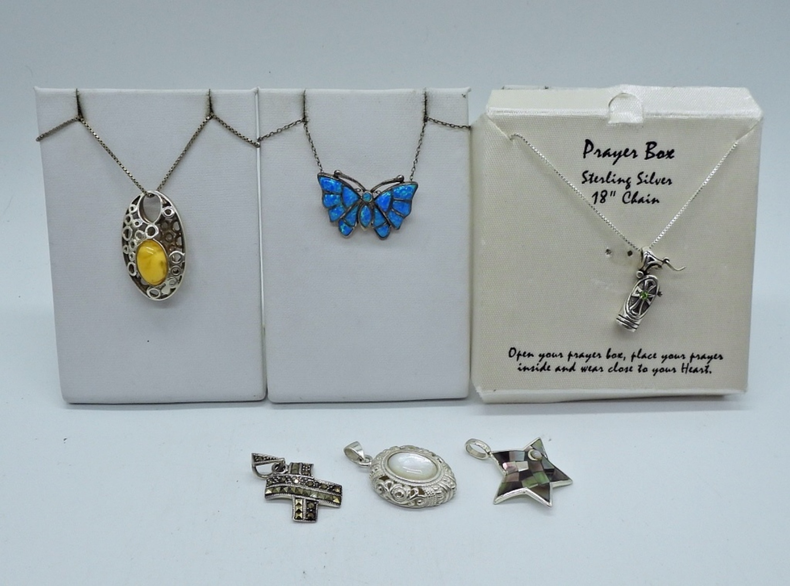THREE NECKLACES WITH PENDANTS AND THREE LOOSE PENDANTS IN STERLING SILVER. CHAINS ARE 18″. 19.2 DWT