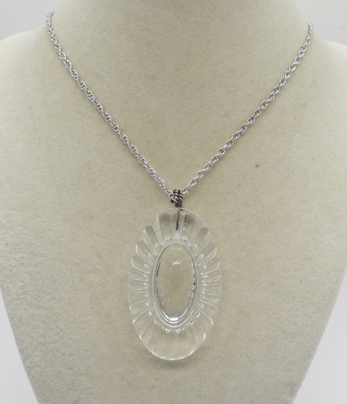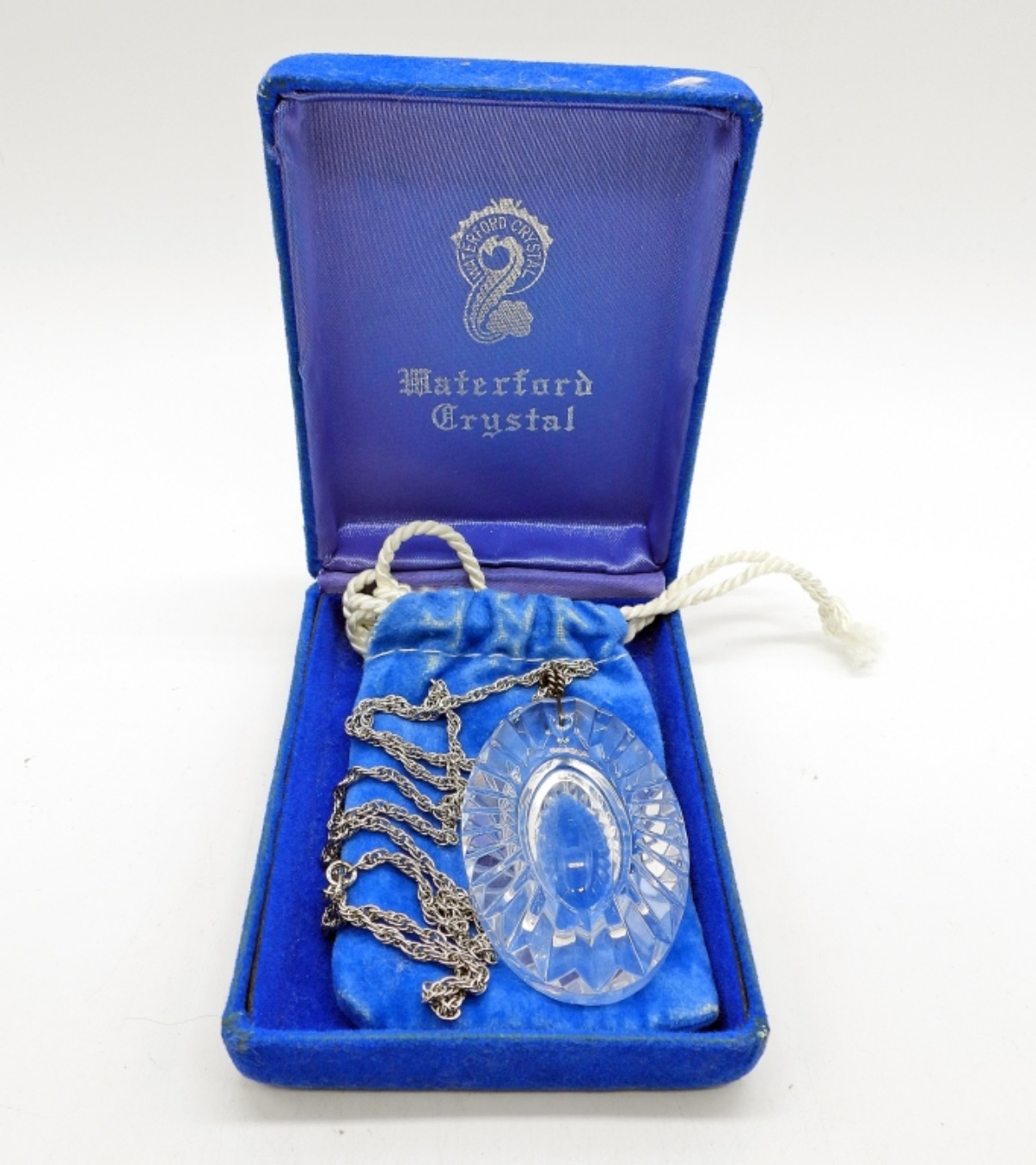 WATERFORD CRYSTAL PENDANT WITH 18″ STERLING CHAIN. COMES IN ORIGINAL WATERFORD BOX & BAG. 3.5 DWT