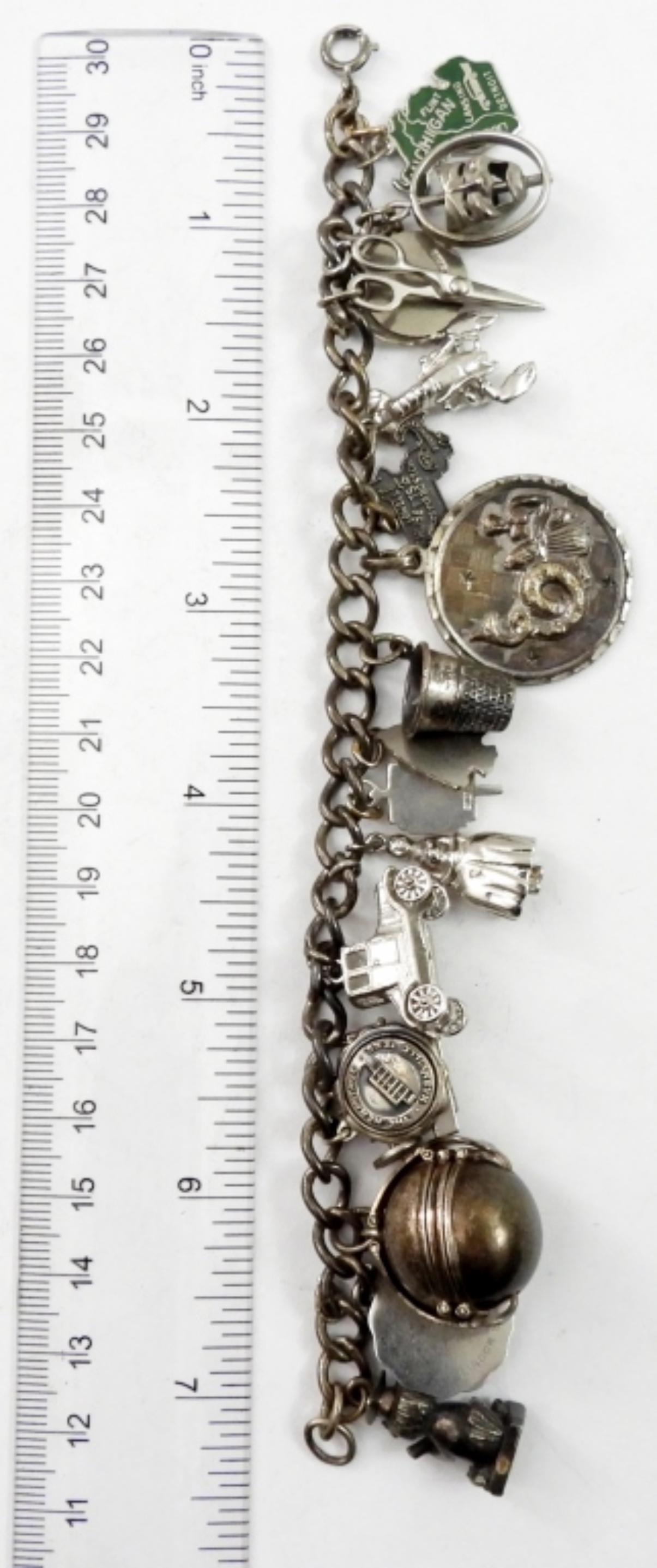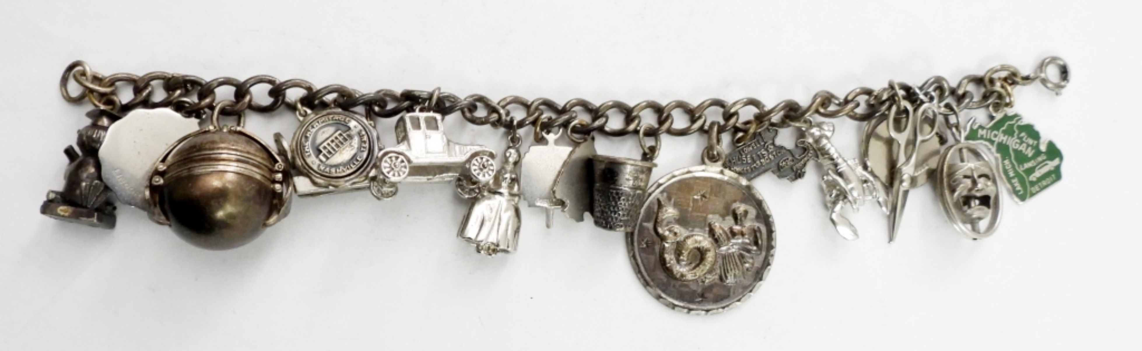 VINTAGE STERLING CHARM BRACELET WITH 16 CHARMS. 7″ LONG. 54.4 DWT