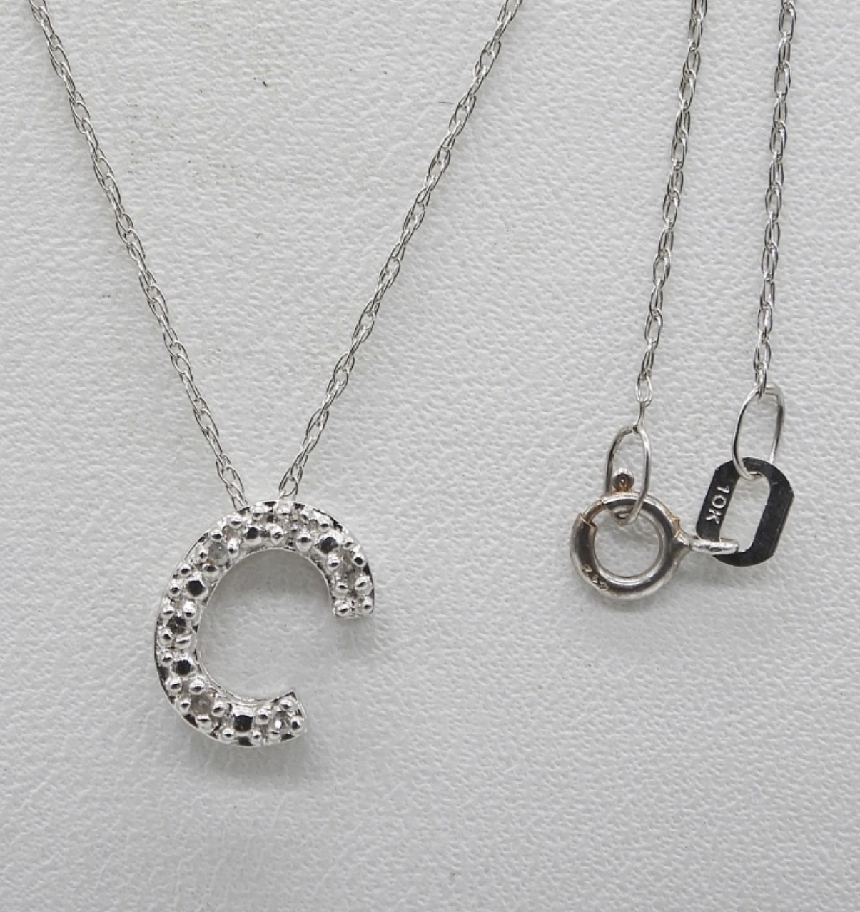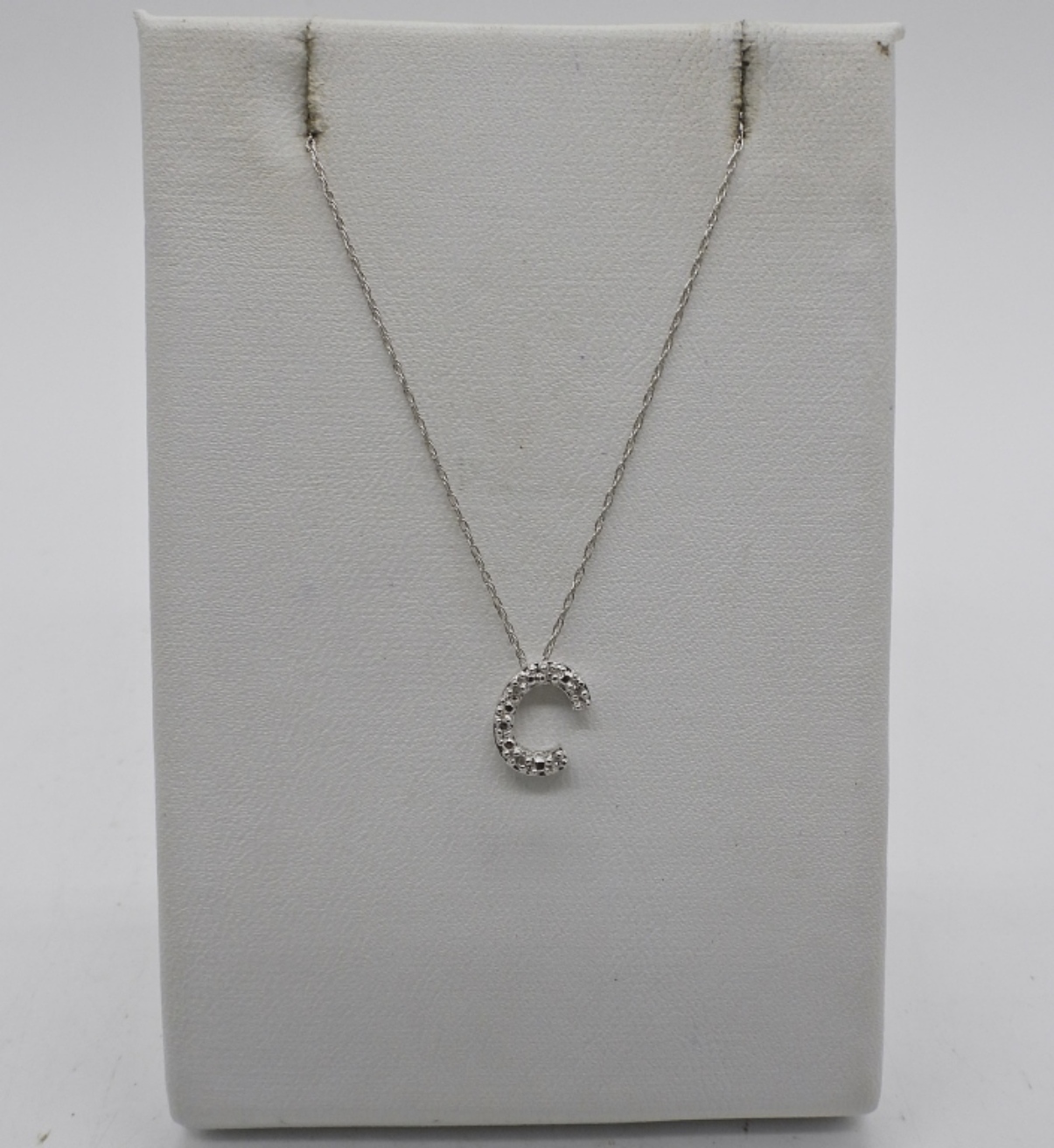 10K WHITE GOLD, LETTER C PENDANT ON A WHITE GOLD CHAIN, 16″. .4DWT