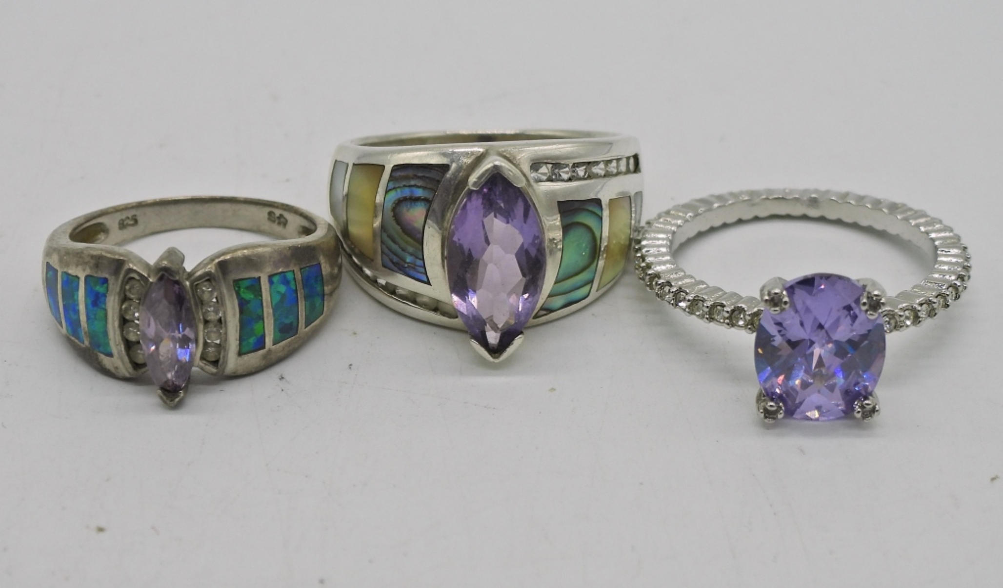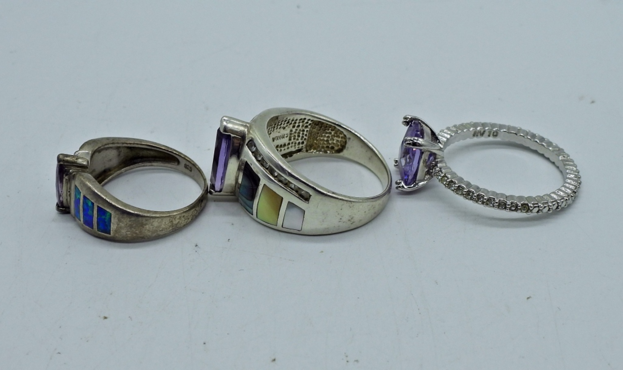 THREE ABSOLUTELY GORGEOUS STERLING RINGS WITH AMETHYST, MOTHER OF PEARL AND OPAL INLAY. SIZES 8 & 10. 12 DWT