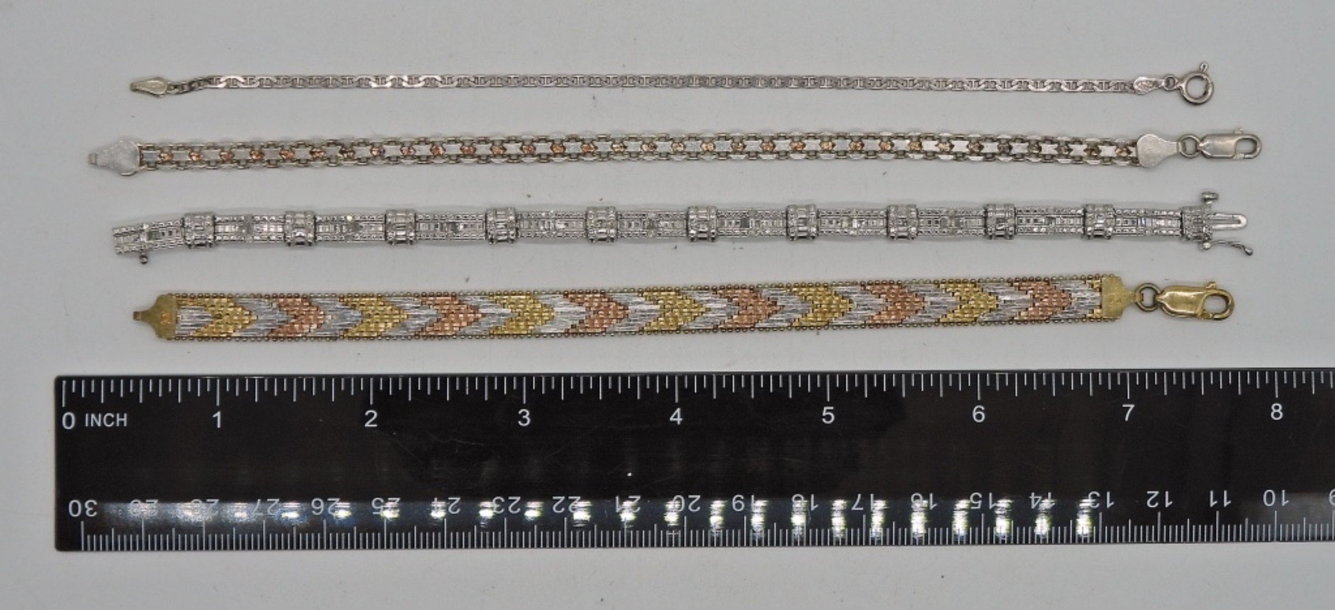 FOUR STERLING, GOLD AND SILVER TONE BRACELETS. 7-7.5″. 27.6 DWT