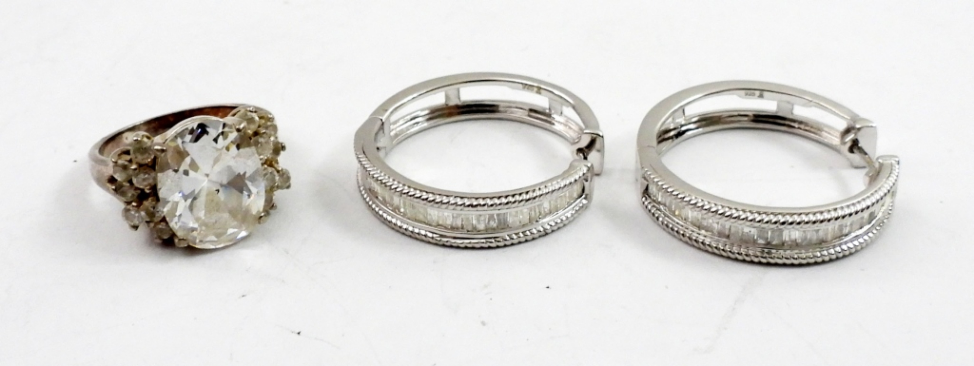 16 IN STERLING NECKLACE, A SIZE 7 RING WITH DIAMOND LIKE STONES ,PAIR OF EARRINGS AND A BROOCH. 31.9 DWT