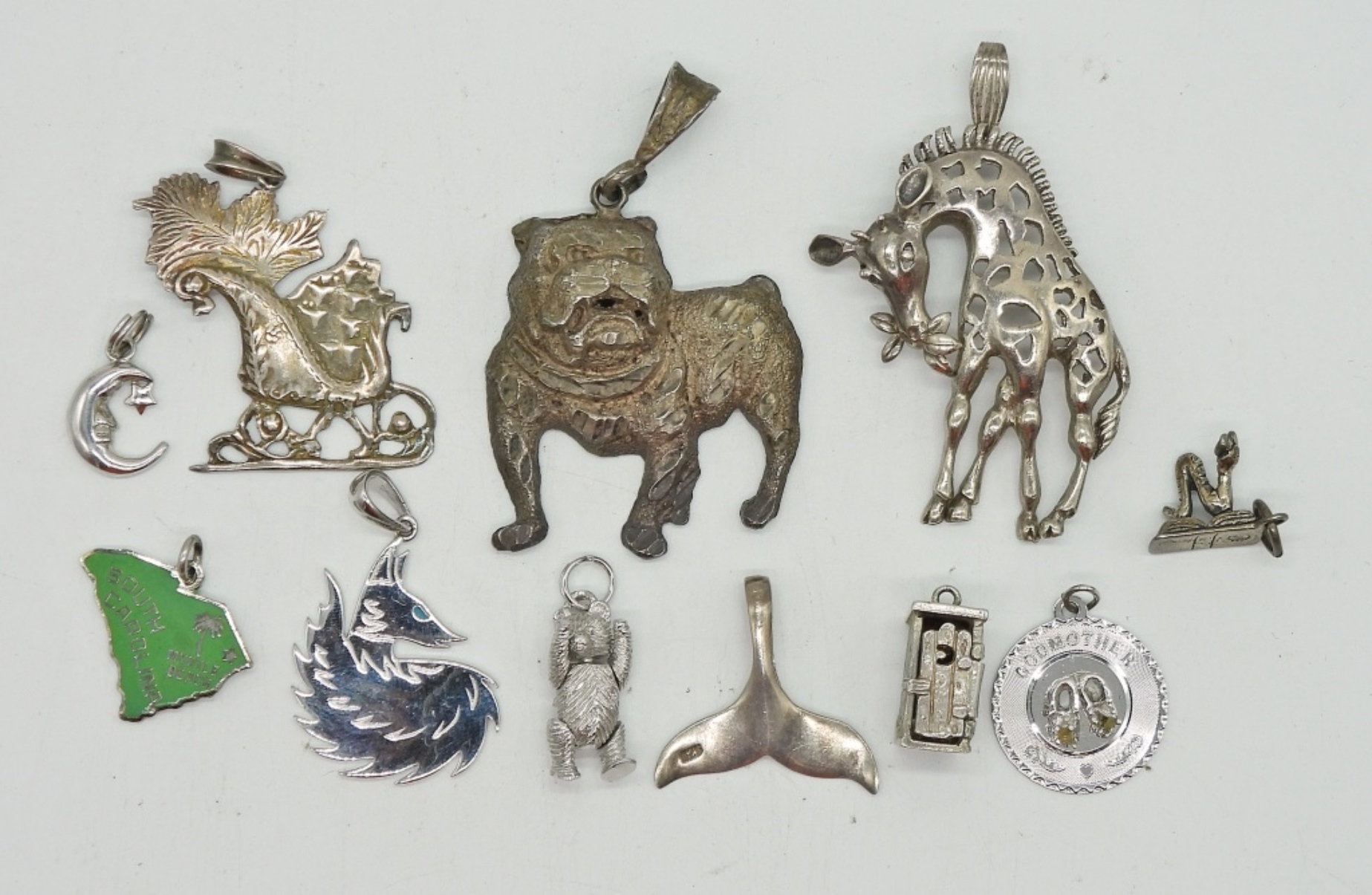TEN STERLING SILVER CHARMS AND PENDANTS. BULLDOG MEASURES 2″. 28.8 DWT