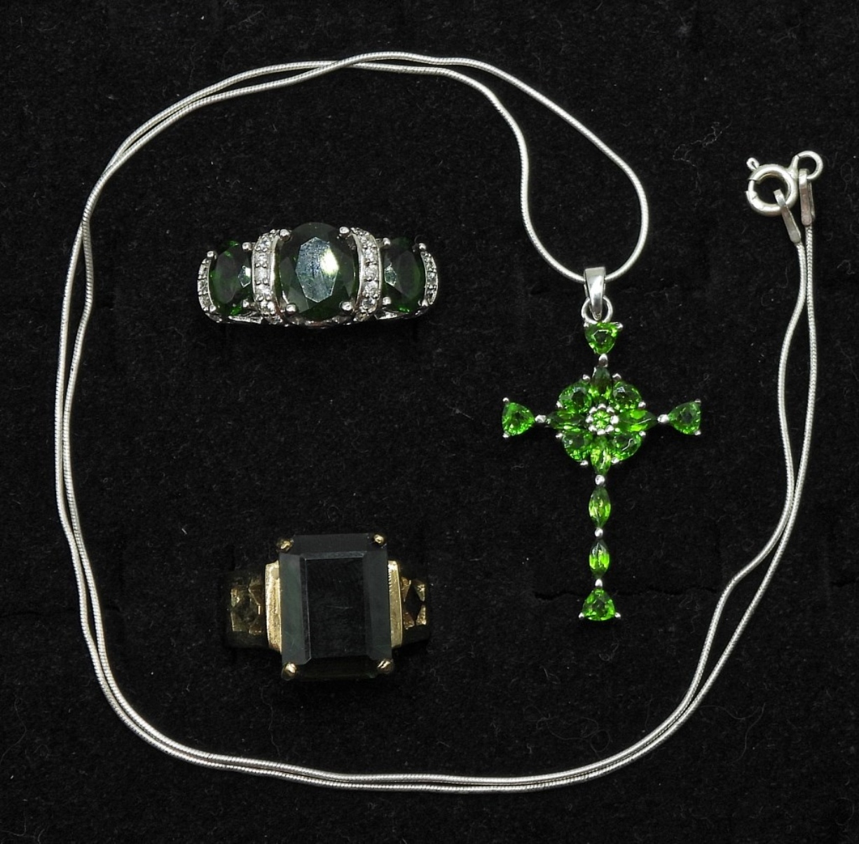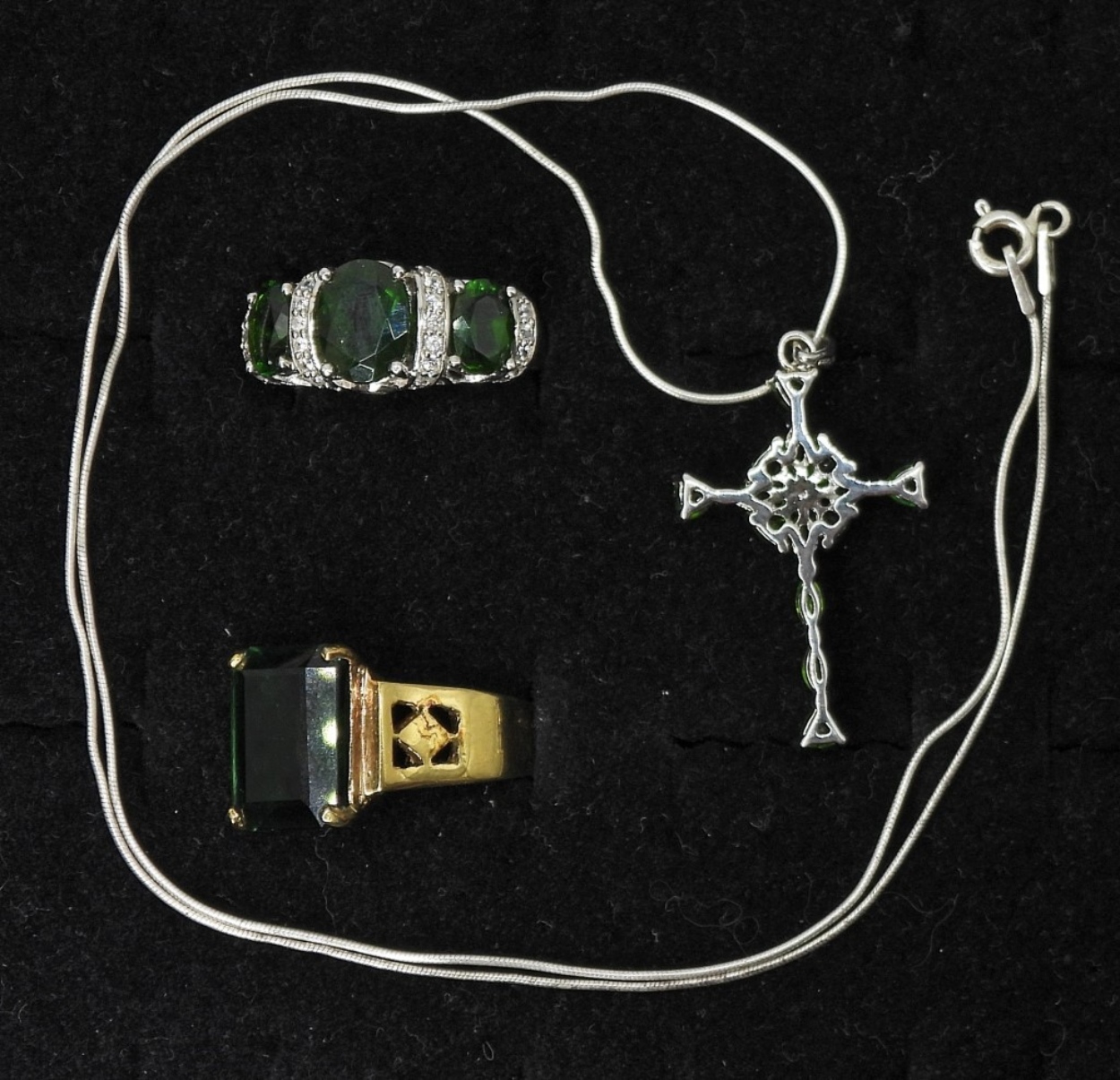 GORGEOUS CROSS NECKLACE WITH GREEN GEMSTONES ON AN 18″ STERLING CHAIN. TWO BEAUTIFUL STERLING RINGS (ONE GOLD TONE) WITH GREEN GEMSTONES, SIZE 7. 10.7DWT