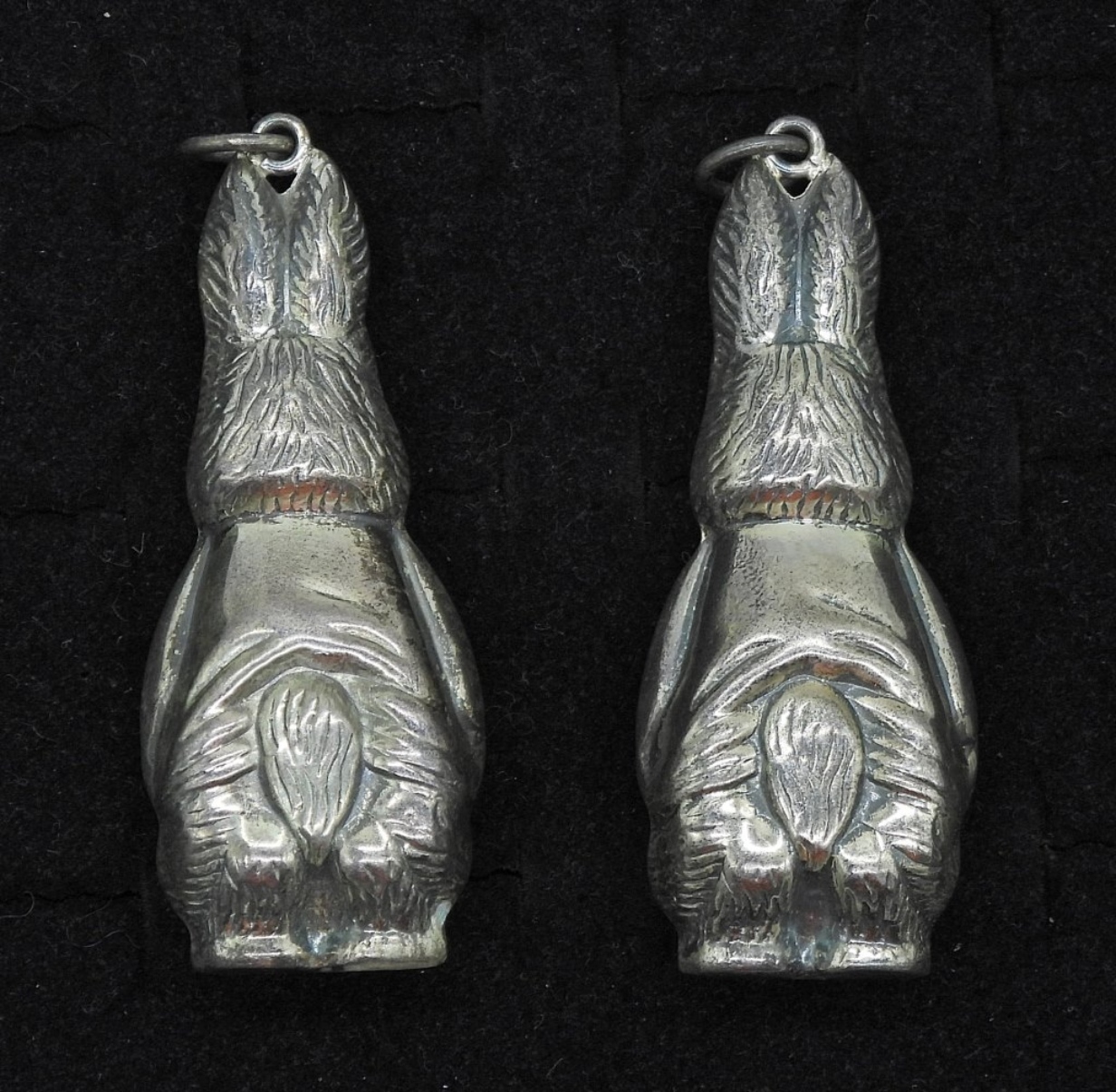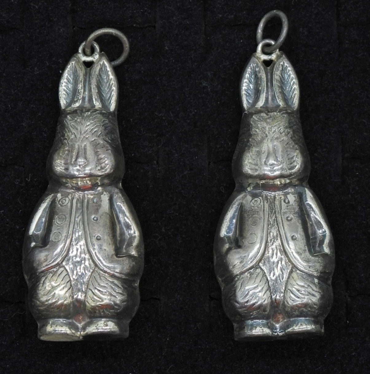 TWO STERLING PETER RABBIT PENDANTS, 3″. 15.1 DWT