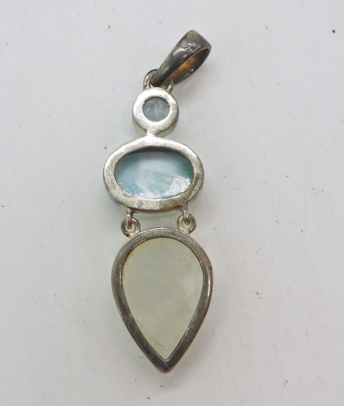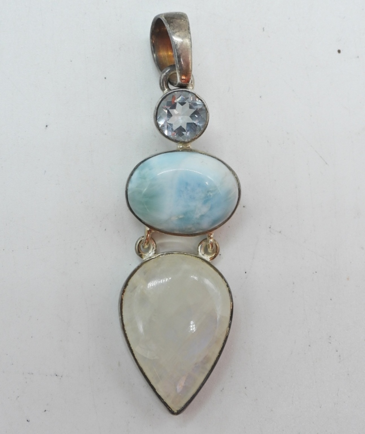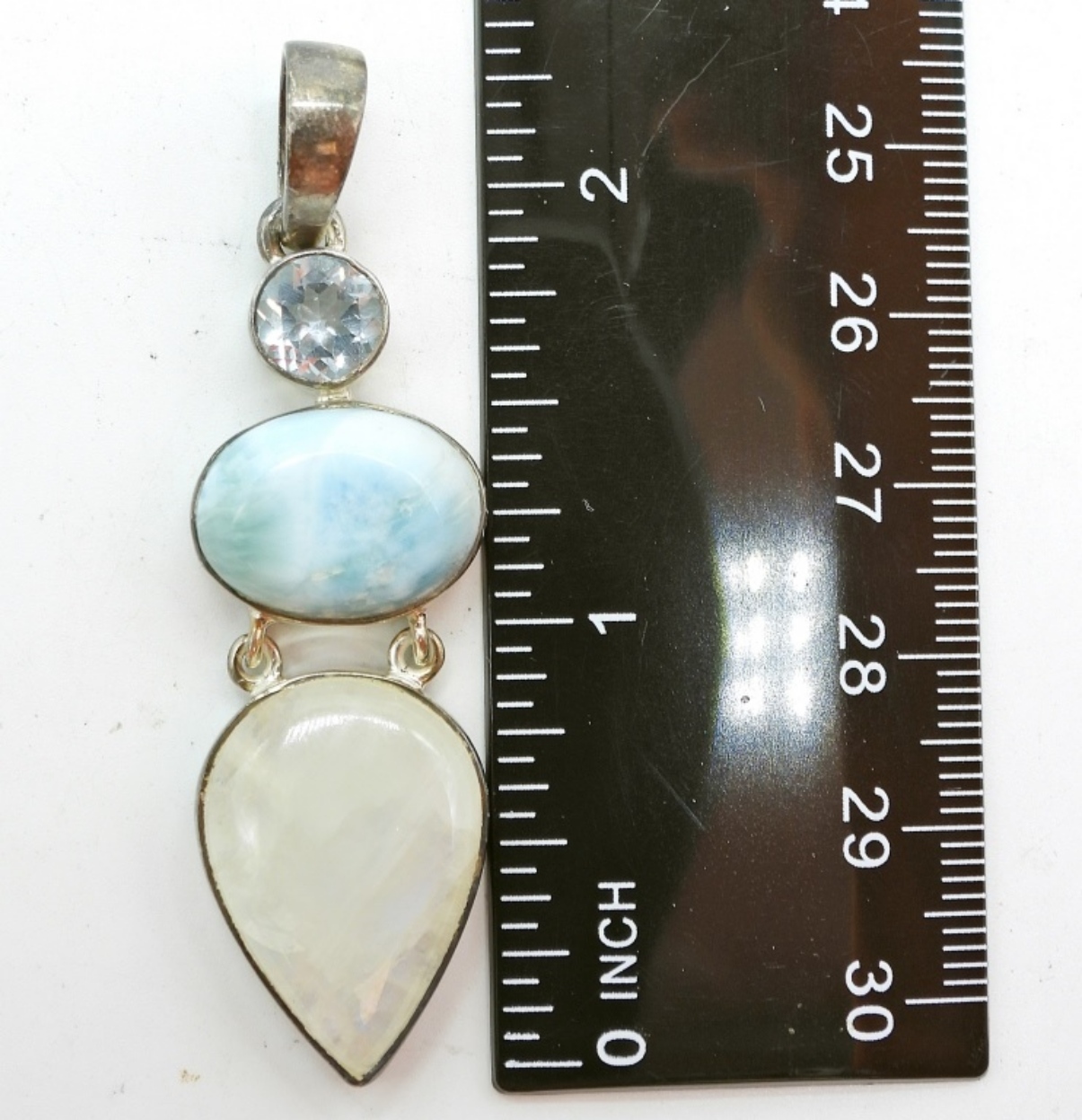 STERLING PENDANT WITH LARIMRA & MOONSTONE GEMSTONES, 2.5″ LONG. 6.9 DWT