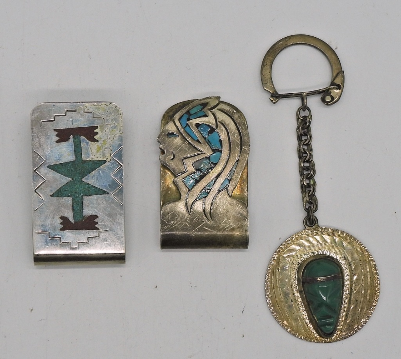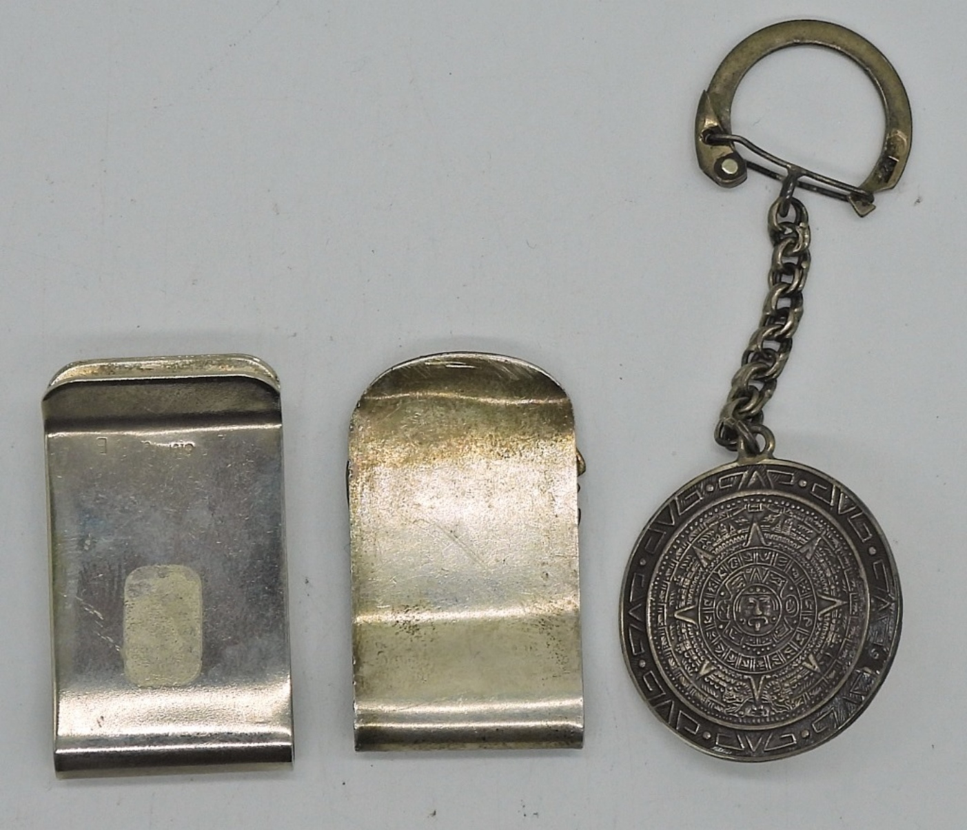 TWO STERLING SOUTHWEST TURQUOISE INLAY MONEY CLIPS, 1.5-2″. STERLING & GOLD TONED KEYCHAIN, MAYAN CALENDAR WITH GREEN OBSIDIAN GEMSTONE. 34.2 DWT
